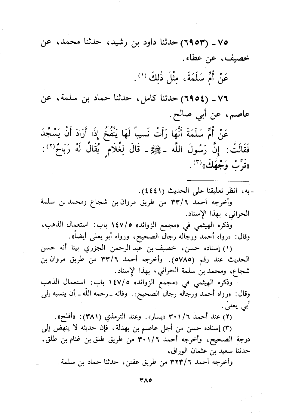 6954 - حَدَّثَنَا كَامِلٌ، حَدَّثَنَا حَمَّادُ بْنُ سَلَمَةَ، عَنْ عَاصِمٍ، عَنْ أَبِي صَالِحٍ، عَنْ أُمِّ سَلَمَةَ، أَنَّهَا رَأَتْ نَسِيبًا لَهَا يَنْفُخُ إِذَا أَرَادَ أَنْ يَسْجُدَ، فَقَالَتْ: إِنَّ رَسُولَ اللَّهِ صَلَّى اللهُ عَلَيْهِ وَسَلَّمَ قَالَ لِغُلَامٍ يُقَالُ لَهُ رَبَاحٌ: «§تَرِّبْ وَجْهَكَ» Kإسناده حسن