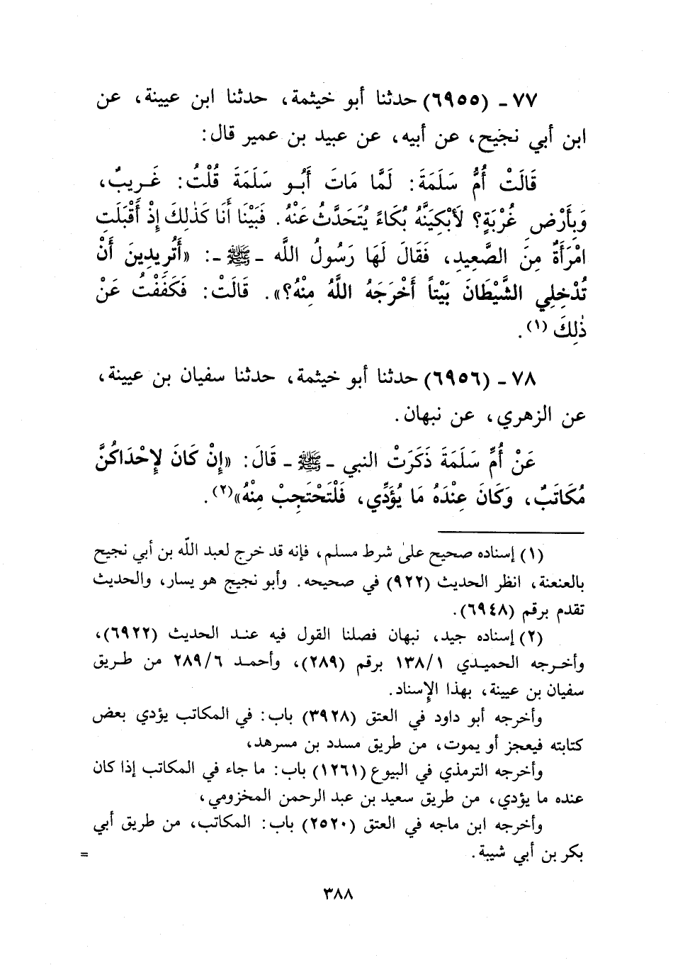 6956 - حَدَّثَنَا أَبُو خَيْثَمَةَ، حَدَّثَنَا سُفْيَانُ بْنُ عُيَيْنَةَ، عَنِ الزُّهْرِيِّ، عَنْ نَبْهَانَ، عَنْ أُمِّ سَلَمَةَ، ذَكَرَتِ النَّبِيَّ صَلَّى اللهُ عَلَيْهِ وَسَلَّمَ قَالَ: «§إِنْ كَانَ لِإِحْدَاكُنَّ مُكَاتَبٌ، وَكَانَ عِنْدَهُ مَا يُؤَدِّي، فَلْتَحْتَجِبْ مِنْهُ» Kإسناده جيد