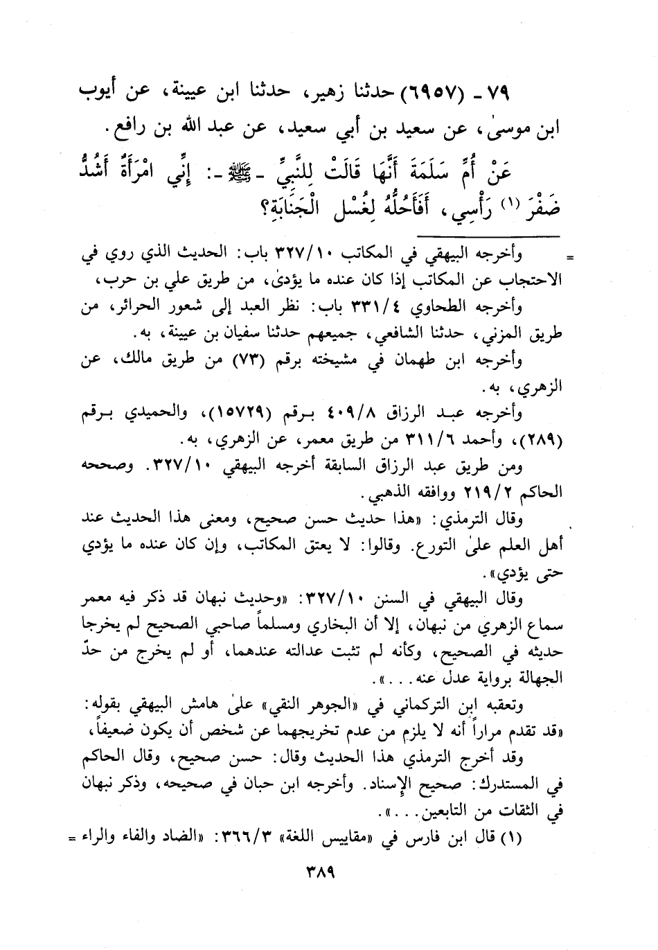 6957 - حَدَّثَنَا زُهَيْرٌ، حَدَّثَنَا ابْنُ عُيَيْنَةَ، عَنْ أَيُّوبَ بْنِ مُوسَى، عَنْ سَعِيدِ بْنِ أَبِي سَعِيدٍ، عَنْ عَبْدِ اللَّهِ بْنِ رَافِعٍ، عَنْ أُمِّ سَلَمَةَ، أَنَّهَا قَالَتْ لِلنَّبِيِّ صَلَّى اللهُ عَلَيْهِ وَسَلَّمَ: إِنِّي امْرَأَةٌ أَشَدُّ ضَفْرَ رَأْسِي، أَفَأَحُلُّهُ لِغُسْلِ الْجَنَابَةِ؟ -[390]- قَالَ: «إِنَّمَا §يَكْفِيكِ أَنْ تَحْثِيَ عَلَيْهِ ثَلَاثَ حَثَيَاتٍ مِنْ مَاءٍ، ثُمَّ تُفِيضِي عَلَيْهِ فَإِذَا أَنْتِ قَدْ طَهُرَتِ» Kإسناده صحيح