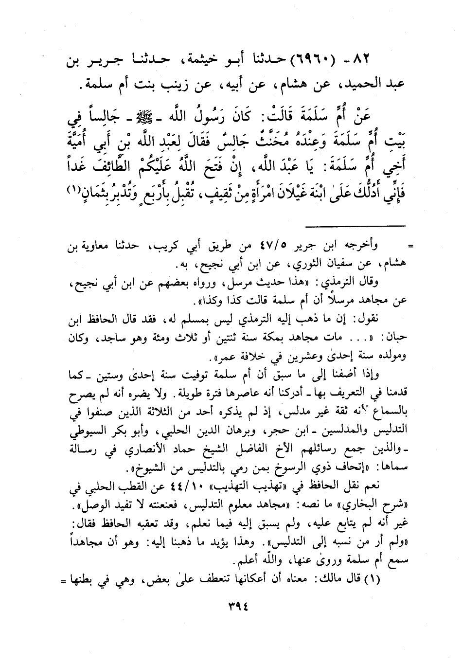 6960 - حَدَّثَنَا أَبُو خَيْثَمَةَ، حَدَّثَنَا جَرِيرُ بْنُ عَبْدِ الْحَمِيدِ، عَنْ هِشَامٍ، عَنْ أَبِيهِ، عَنْ زَيْنَبَ بِنْتِ أُمِّ سَلَمَةَ، عَنْ أُمِّ سَلَمَةَ، قَالَتْ: كَانَ رَسُولُ اللَّهِ صَلَّى اللهُ عَلَيْهِ وَسَلَّمَ جَالِسًا فِي بَيْتِ أُمِّ سَلَمَةَ وَعِنْدَهُ مُخَنَّثٌ جَالِسٌ، فَقَالَ لِعَبْدِ اللَّهِ بْنِ أَبِي أُمَيَّةَ أَخِي أُمِّ سَلَمَةَ: يَا عَبْدَ اللَّهِ، إِنْ فَتَحَ اللَّهُ عَلَيْكُمُ الطَّائِفَ غَدًا فَإِنِّي أَدُلُّكَ عَلَى ابْنَةِ غَيْلَانَ امْرَأَةٍ مِنْ ثَقِيفٍ، تُقْبِلُ بِأَرْبَعٍ وَتُدْبِرُ بِثَمَانٍ -[395]-، فَقَالَ رَسُولُ اللَّهِ صَلَّى اللهُ عَلَيْهِ وَسَلَّمَ: «§لَا يَدْخُلُ هَذَا عَلَيْكُمْ» Kإسناده صحيح