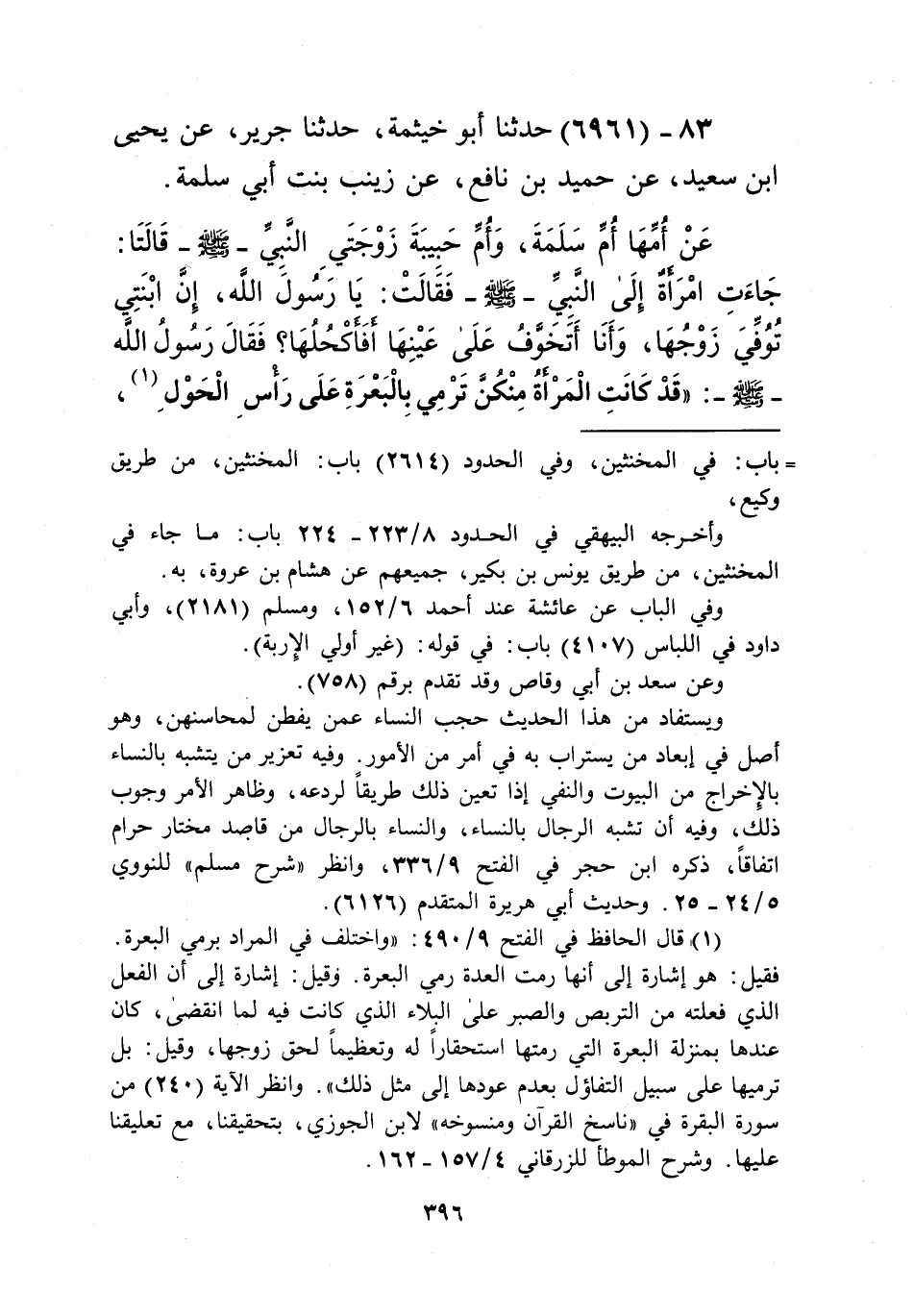 6961 - حَدَّثَنَا أَبُو خَيْثَمَةَ، حَدَّثَنَا جَرِيرٌ، عَنْ يَحْيَى بْنِ سَعِيدٍ، عَنْ حُمَيْدِ بْنِ نَافِعٍ، عَنْ زَيْنَبَ بِنْتِ أَبِي سَلَمَةَ، عَنْ أُمِّهَا أُمِّ سَلَمَةَ، وَأَمِّ حَبِيبَةَ، زَوْجَتَيِ النَّبِيِّ صَلَّى اللهُ عَلَيْهِ وَسَلَّمَ قَالَتَا: جَاءَتِ امْرَأَةٌ إِلَى النَّبِيِّ صَلَّى اللهُ عَلَيْهِ وَسَلَّمَ فَقَالَتْ: يَا رَسُولَ اللَّهِ، إِنَّ ابْنَتِي تُوُفِّيَ زَوْجُهَا، وَأَنَا أَتَخَوَّفُ عَلَى عَيْنِهَا أَفَأَكْحَلُهَا؟ فَقَالَ رَسُولُ اللَّهِ صَلَّى اللهُ عَلَيْهِ وَسَلَّمَ: «§قَدْ كَانَتِ الْمَرْأَةُ مِنْكُنَّ تَرْمِي بِالْبَعْرَةِ عَلَى رَأْسِ الْحَوْلِ -[397]- وَإِنَّمَا هِيَ أَرْبَعَةُ أَشْهُرٍ وَعَشْرٌ» Kإسناده صحيح