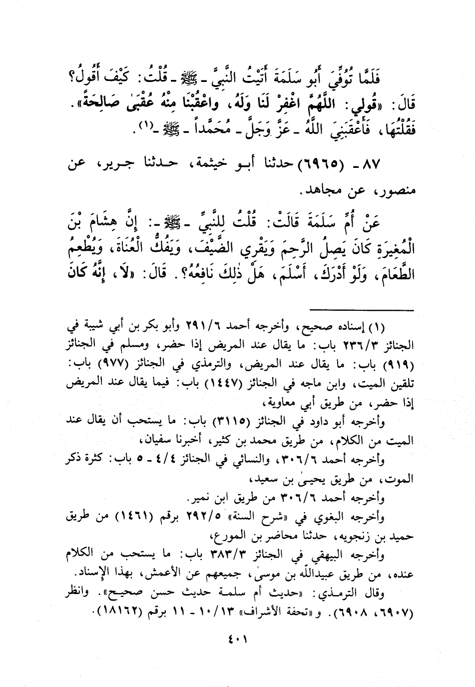 6965 - حَدَّثَنَا أَبُو خَيْثَمَةَ، حَدَّثَنَا جَرِيرٌ، عَنْ مَنْصُورٍ، عَنْ مُجَاهِدٍ، عَنْ أُمِّ سَلَمَةَ قَالَتْ: قُلْتُ لِلنَّبِيِّ صَلَّى اللهُ عَلَيْهِ وَسَلَّمَ: إِنَّ هِشَامَ بْنَ الْمُغِيرَةِ كَانَ يَصِلُ الرَّحِمَ وَيَقْرِي الضَّيْفَ، وَيَفُكُّ الْعُنَاةَ، وَيُطْعِمُ الطَّعَامَ، وَلَوْ أَدْرَكَ أَسْلَمَ، هَلْ ذَلِكَ نَافِعُهُ؟ قَالَ: " لَا، §إِنَّهُ كَانَ يُعْطِي لِلدُّنْيَا وَذِكْرِهَا وَحَمْدِهَا، وَلَمْ يَقُلْ يَوْمًا قَطُّ: رَبِّ اغْفِرْ لِي يَوْمَ الدِّينِ "Kإسناده صحيح