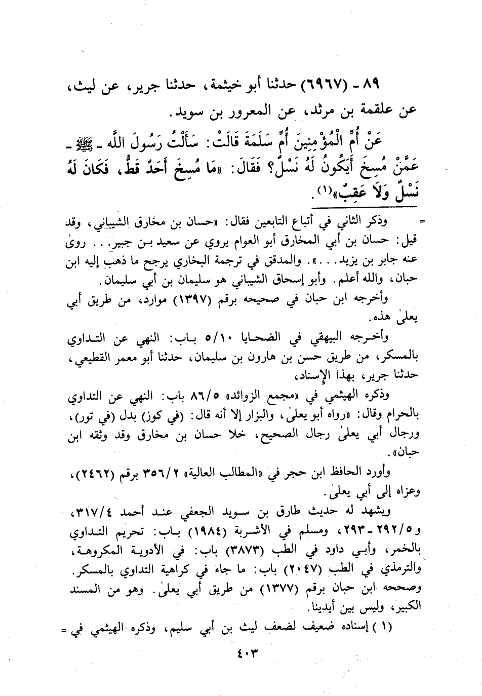 6967 - حَدَّثَنَا أَبُو خَيْثَمَةَ، حَدَّثَنَا جَرِيرٌ، عَنْ لَيْثٍ، عَنْ عَلْقَمَةَ بْنِ مَرْثَدٍ، عَنِ الْمَعْرُورِ بْنِ سُوَيْدٍ، عَنْ أُمِّ الْمُؤْمِنِينَ أُمِّ سَلَمَةَ، قَالَتْ: سَأَلْتُ رَسُولَ اللَّهِ صَلَّى اللهُ عَلَيْهِ وَسَلَّمَ عَمَّنْ مُسِخَ أَيَكُونُ لَهُ نَسْلٌ؟ فَقَالَ: «§مَا مُسِخَ أَحَدٌ قَطُّ، فَكَانَ لَهُ نَسْلٌ وَلَا عَقِبٌ» Kإسناده ضعيف