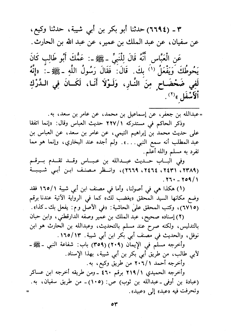 6694 - حَدَّثَنَا أَبُو بَكْرِ بْنُ أَبِي شَيْبَةَ، حَدَّثَنَا وَكِيعٌ، عَنْ سُفْيَانَ، عَنْ عَبْدِ الْمَلِكِ بْنِ عُمَيْرٍ، عَنْ عَبْدِ اللَّهِ بْنِ الْحَارِثِ، عَنِ الْعَبَّاسِ، أَنَّهُ قَالَ لِلنَّبِيِّ صَلَّى اللهُ عَلَيْهِ وَسَلَّمَ: عَمُّكَ أَبُو طَالِبٍ كَانَ يَحُوطُكَ، وَيَفْعَلُ بِكَ قَالَ: فَقَالَ رَسُولُ اللَّهِ صَلَّى اللهُ عَلَيْهِ وَسَلَّمَ: «§إِنَّهُ لَفِي ضَحْضَاحٍ مِنَ النَّارِ، وَلَوْلَا أَنَا لَكَانَ فِي الدَّرْكِ الْأَسْفَلِ» Kإسناده صحيح