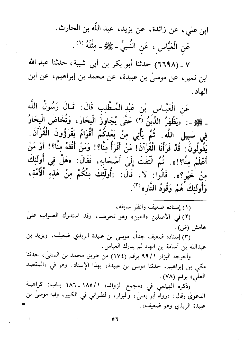 6698 - حَدَّثَنَا أَبُو بَكْرِ بْنُ أَبِي شَيْبَةَ، حَدَّثَنَا عَبْدُ اللَّهِ بْنُ نُمَيْرٍ، عَنْ مُوسَى بْنِ عُبَيْدَةَ، عَنْ مُحَمَّدِ بْنِ إِبْرَاهِيمَ، عَنِ ابْنِ الْهَادِ، عَنِ الْعَبَّاسِ بْنِ عَبْدِ الْمُطَّلِبِ قَالَ: قَالَ رَسُولُ اللَّهِ صَلَّى اللهُ عَلَيْهِ وَسَلَّمَ: " §يَظْهَرُ الدِّينُ، حَتَّى يُجَاوِزَ الْبِحَارَ، وَتُخَاضُ الْبِحَارُ فِي سَبِيلِ اللَّهِ، ثُمَّ يَأْتِي مِنْ بَعْدِكُمْ أَقْوَامٌ يَقْرَءُونَ الْقُرْآنَ. يَقُولُونَ: قَدْ قَرَأْنَا الْقُرْآنَ مَنْ أَقْرَأُ مِنَّا؟ وَمَنْ أَفْقَهُ مِنَّا؟ أَوْ مَنْ أَعْلَمُ مِنَّا؟ " ثُمَّ الْتَفَتَ إِلَى أَصْحَابِهِ فَقَالَ: «هَلْ فِي أُولَئِكَ مِنْ خَيْرٍ؟» قَالُوا: لَا. قَالَ: «أُولَئِكَ مِنْكُمْ مِنْ هَذِهِ الْأُمَّةِ، وَأُولَئِكَ هُمْ وَقُودُ النَّارِ» Kإسناده ضعيف جدا