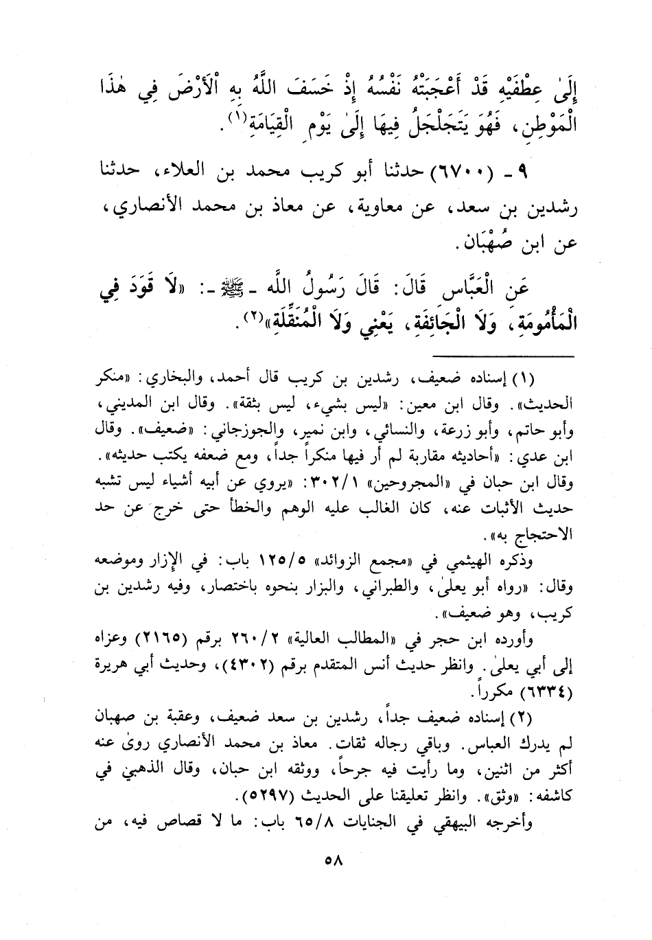 6700 - حَدَّثَنَا أَبُو كُرَيْبٍ مُحَمَّدُ بْنُ الْعَلَاءِ، حَدَّثَنَا رِشْدِينُ بْنُ سَعْدٍ، عَنْ مُعَاوِيَةَ، عَنْ مُعَاذِ بْنِ مُحَمَّدٍ الْأَنْصَارِيِّ، عَنِ ابْنِ صُهْبَانَ، عَنِ الْعَبَّاسِ قَالَ: قَالَ رَسُولُ اللَّهِ صَلَّى اللهُ عَلَيْهِ وَسَلَّمَ: «§لَا قَوَدَ فِي الْمَأْمُومَةِ وَلَا الْجَائِفَةِ» يَعْنِي: وَلَا الْمُنَقِّلَةِKإسناده ضعيف جدا