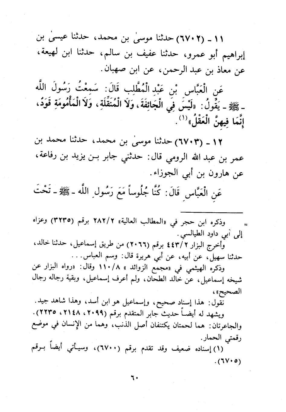 6702 - حَدَّثَنَا مُوسَى بْنُ مُحَمَّدٍ، حَدَّثَنَا عِيسَى بْنُ إِبْرَاهِيمَ أَبُو عَمْرٍو، حَدَّثَنَا عَفِيفُ بْنُ سَالِمٍ، حَدَّثَنَا ابْنُ لَهِيعَةَ، عَنْ مُعَاذِ بْنِ عَبْدِ الرَّحْمَنِ، عَنِ ابْنِ صُهْبَانَ، عَنِ الْعَبَّاسِ بْنِ عَبْدِ الْمُطَّلِبِ قَالَ: سَمِعْتُ رَسُولَ اللَّهِ صَلَّى اللهُ عَلَيْهِ وَسَلَّمَ يَقُولُ: «§لَيْسَ فِي الْجَائِفَةِ وَلَا الْمُنَقِّلَةِ وَلَا الْمَأْمُومَةِ قَوَدٌ، إِنَّمَا فِيهِنَّ الْعَقْلُ» Kإسناده ضعيف