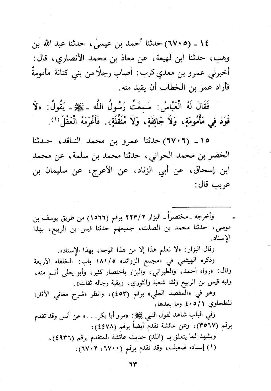 6705 - حَدَّثَنَا أَحْمَدُ بْنُ عِيسَى، حَدَّثَنَا عَبْدُ اللَّهِ بْنُ وَهْبٍ، حَدَّثَنَا ابْنُ لَهِيعَةَ، عَنْ مُعَاذِ بْنِ مُحَمَّدٍ الْأَنْصَارِيِّ قَالَ: أَخْبَرَنِي عَمْرُو بْنُ مَعْدِي كَرِبَ: أَصَابَ رَجُلًا مِنْ بَنِي كِنَانَةَ مَأْمُومَةٌ، فَأَرَادَ عُمَرُ بْنُ الْخَطَّابِ أَنْ يُقِيدَ مِنْهُ. فَقَالَ لَهُ الْعَبَّاسُ: سَمِعْتُ رَسُولَ اللَّهِ صَلَّى اللهُ عَلَيْهِ وَسَلَّمَ يَقُولُ: «§لَا قَوَدَ فِي مَأْمُومَةٍ، وَلَا جَائِفَةٍ، وَلَا مُنَقِّلَةٍ، فَأَغْرَمَهُ الْعَقْلَ» Kإسناده ضعيف