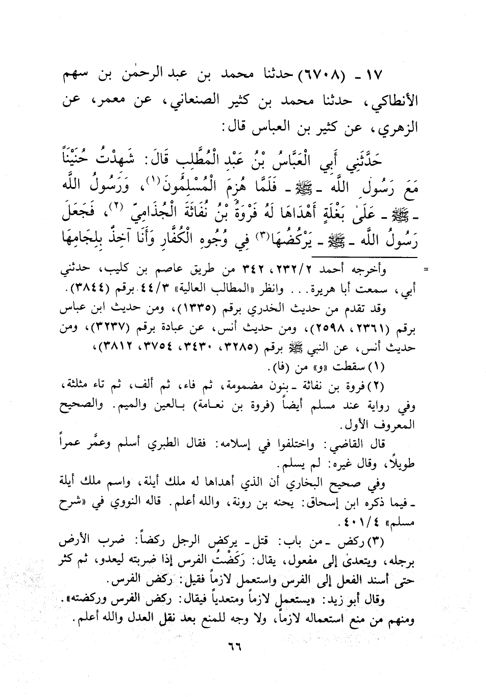 6708 - حَدَّثَنَا مُحَمَّدُ بْنُ عَبْدِ الرَّحْمَنِ بْنِ سَهْمٍ الْأَنْطَاكِيُّ، حَدَّثَنَا مُحَمَّدُ بْنُ كَثِيرٍ الصَّنْعَانِيُّ، عَنْ مَعْمَرٍ، عَنِ الزُّهْرِيِّ، عَنْ كَثِيرِ بْنِ الْعَبَّاسِ قَالَ: حَدَّثَنِي أَبِي الْعَبَّاسُ بْنُ عَبْدِ الْمُطَّلِبِ قَالَ: شَهِدْتُ حُنَيْنًا مَعَ رَسُولِ اللَّهِ صَلَّى اللهُ عَلَيْهِ وَسَلَّمَ، فَلَمَّا هُزِمَ الْمُسْلِمُونَ، وَرَسُولُ اللَّهِ صَلَّى اللهُ عَلَيْهِ وَسَلَّمَ عَلَى بَغْلَةٍ، أَهْدَاهَا لَهُ فَرْوَةُ بْنُ نُفَاثَةَ الْجُذَامِيُّ، فَجَعَلَ رَسُولُ اللَّهِ صَلَّى اللهُ عَلَيْهِ وَسَلَّمَ يَرْكُضُهَا فِي وُجُوهِ الْكُفَّارِ، وَأَنَا آخِذٌ بِلِجَامِهَا -[67]- مَخَافَةَ أَنْ تُسْرِعَ، وَأَبُو سُفْيَانَ بْنُ الْحَارِثِ بْنِ عَبْدِ الْمُطَّلِبِ آخِذٌ بِغَرْزِ رَسُولِ اللَّهِ صَلَّى اللهُ عَلَيْهِ وَسَلَّمَ. قَالَ: فَقَالَ رَسُولُ اللَّهِ صَلَّى اللهُ عَلَيْهِ وَسَلَّمَ: «§نَادِ فِي أَصْحَابِ السَّمُرَةِ». فَنَادَيْتُ بِأَعْلَى صَوْتِي: يَا أَصْحَابَ السَّمُرَةِ، وَدَاعُونَ فِي الْأَنْصَارِ: يَا مَعْشَرَ الْأَنْصَارِ ثُمَّ قَصُرَتِ الدَّعْوَةُ عَلَى بَنِي الْحَارِثِ بْنِ الْخَزْرَجِ، وَكَانُوا أَصْبَرَ عَلَى الْمَوْتِ، فَقَالُوا: يَا لَبَّيْكَ يَا لَبَّيْكَ فَوَاللَّهِ مَا شَبَّهْتُ عَطْفَهُمْ عَلَى رَسُولِ اللَّهِ صَلَّى اللهُ عَلَيْهِ وَسَلَّمَ إِلَّا كَعَطْفِ بَقَرٍ عَلَى أَوْلَادِهَا. قَالَ: فَتَقَدَّمُوا فَاقْتَتَلُوا قِتَالًا شَدِيدًا، فَلَمَّا رَأَى ذَلِكَ رَسُولُ اللَّهِ صَلَّى اللهُ عَلَيْهِ وَسَلَّمَ تَنَاوَلَ قَبْضَةً مِنْ حَصْبَاءَ، فَرَمَى بِهَا وُجُوهَ الْقَوْمِ، وَقَالَ: «شَاهَتِ الْوُجُوهُ» قَالَ: فَوَاللَّهِ مَا زِلْتُ أَرَى حَدَّهُمْ كَلِيلًا وَأَمْرَهُمْ مُدْبِرًا حَتَّى هَزَمَهُمُ اللَّهُKإسناده ضعيف