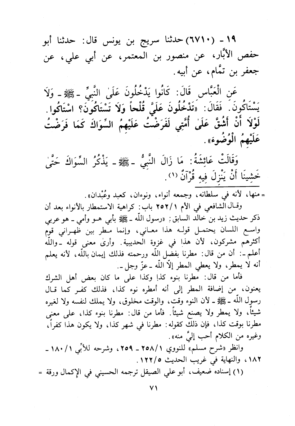6710 - حَدَّثَنَا سُرَيْجُ بْنُ يُونُسَ قَالَ: حَدَّثَنَا أَبُو حَفْصٍ الْأَبَّارُ، عَنْ مَنْصُورِ بْنِ الْمُعْتَمِرِ، عَنْ أَبِي عَلِيٍّ، عَنْ جَعْفَرِ بْنِ تَمَّامٍ، عَنْ أَبِيهِ، عَنِ الْعَبَّاسِ قَالَ: كَانُوا يَدْخُلُونَ عَلَى النَّبِيِّ صَلَّى اللهُ عَلَيْهِ وَسَلَّمَ وَلَا يَسْتَاكُونَ، فَقَالَ: «§تَدْخُلُونَ عَلَيَّ قُلْحًا وَلَا تَسْتَاكُونَ؟ اسْتَاكُوا. لَوْلَا أَنْ أَشُقَّ عَلَى أُمَّتِي لَفَرَضْتُ عَلَيْهِمُ السِّوَاكَ كَمَا فَرَضْتُ عَلَيْهِمُ الْوُضُوءَ» وَقَالَتْ عَائِشَةُ: «مَا زَالَ النَّبِيُّ صَلَّى اللهُ عَلَيْهِ وَسَلَّمَ يَذْكُرُ السِّوَاكَ حَتَّى خَشِينَا أَنْ يَنْزِلَ فِيهِ قُرْآنٌ» Kإسناده ضعيف