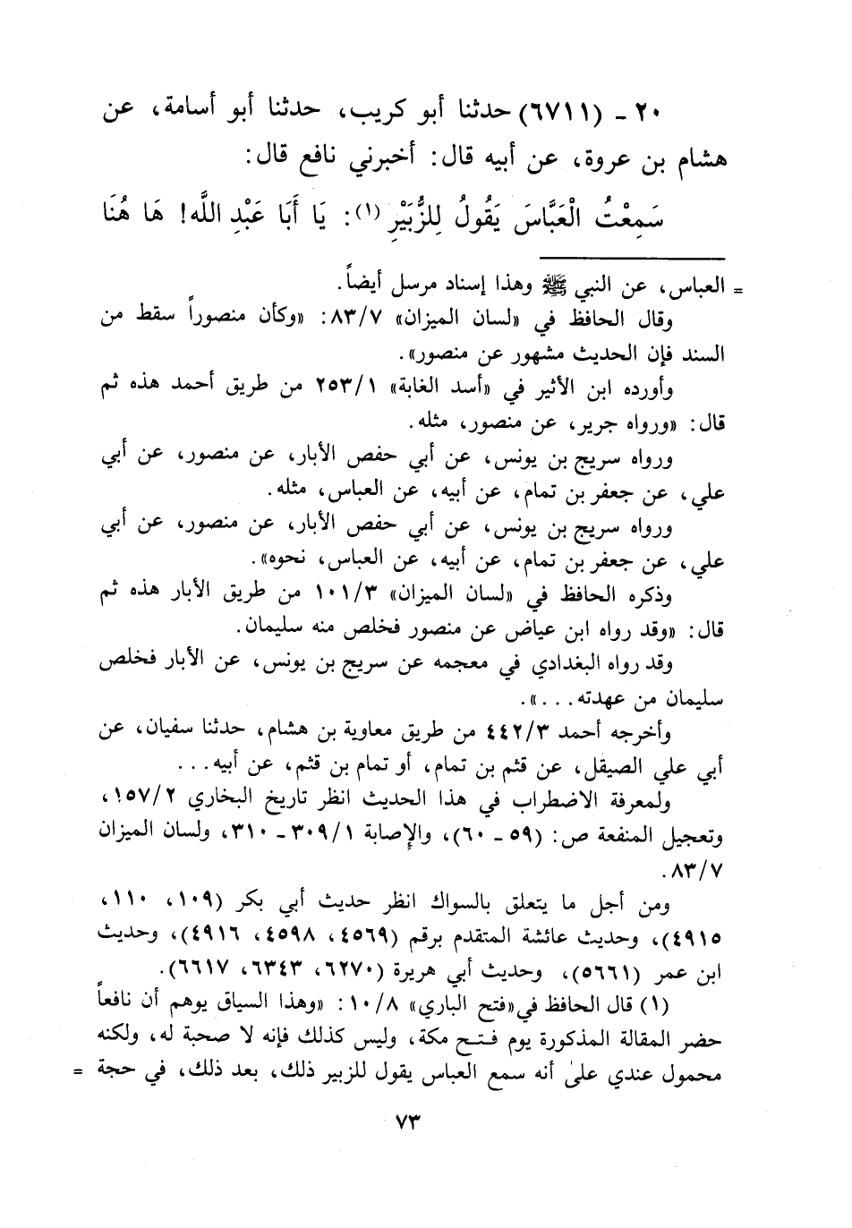 6711 - حَدَّثَنَا أَبُو كُرَيْبٍ، حَدَّثَنَا أَبُو أُسَامَةَ، عَنْ هِشَامِ بْنِ عُرْوَةَ، عَنْ أَبِيهِ قَالَ: أَخْبَرَنِي نَافِعٌ قَالَ: سَمِعْتُ الْعَبَّاسَ يَقُولُ لِلزُّبَيْرِ: «يَا أَبَا عَبْدِ اللَّهِ، §هَا هُنَا أَمَرَكَ رَسُولُ اللَّهِ صَلَّى اللهُ عَلَيْهِ وَسَلَّمَ أَنْ تَرْكُزَ الرَّايَةَ»، يَعْنِي يَوْمَ فَتْحِ مَكَّةَKإسناده صحيح