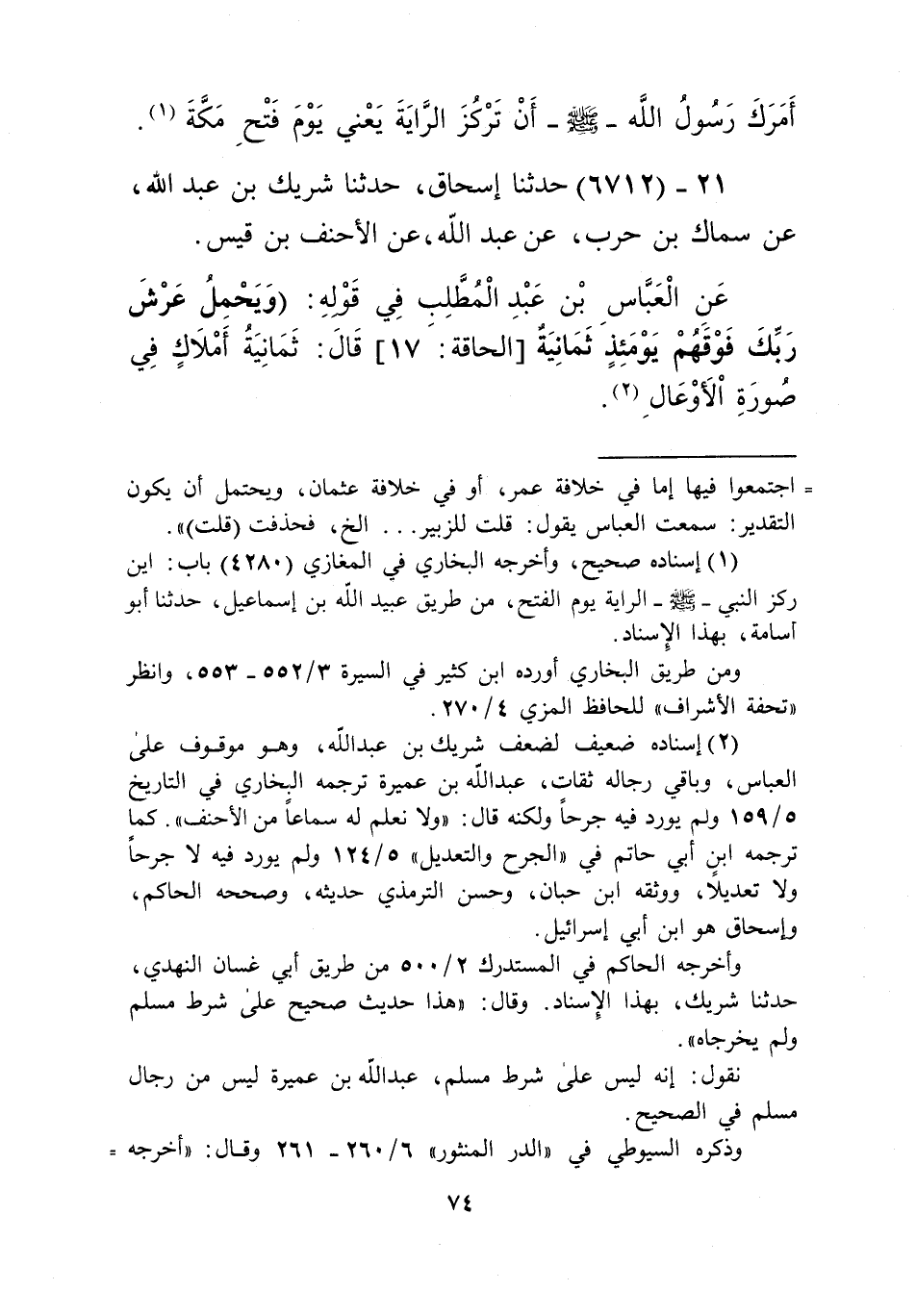 6712 - حَدَّثَنَا إِسْحَاقُ، حَدَّثَنَا شَرِيكُ بْنُ عَبْدِ اللَّهِ، عَنْ سِمَاكِ بْنِ حَرْبٍ، عَنْ عَبْدِ اللَّهِ، عَنِ الْأَحْنَفِ بْنِ قَيْسٍ، عَنِ الْعَبَّاسِ بْنِ عَبْدِ الْمُطَّلِبِ فِي قَوْلِهِ: {§وَيَحْمِلُ عَرْشَ رَبِّكَ فَوْقَهُمْ يَوْمَئِذٍ ثَمَانِيَةٌ} [الحاقة: 17] قَالَ: «ثَمَانِيَةُ أَمْلَاكٍ فِي صُورَةِ الْأَوْعَالِ» Kإسناده ضعيف