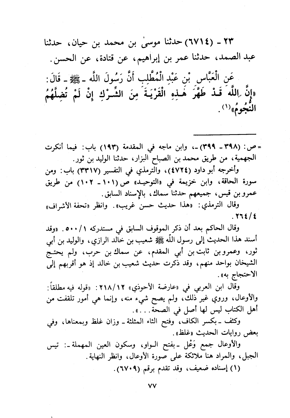 6714 - حَدَّثَنَا مُوسَى بْنُ حَيَّانَ، حَدَّثَنَا عَبْدُ الصَّمَدِ، حَدَّثَنَا عُمَرُ بْنُ إِبْرَاهِيمَ، عَنْ قَتَادَةَ، عَنِ الْحَسَنِ، عَنِ الْعَبَّاسِ بْنِ عَبْدِ الْمُطَّلِبِ، أَنَّ رَسُولَ اللَّهِ صَلَّى اللهُ عَلَيْهِ وَسَلَّمَ قَالَ: «إِنَّ §اللَّهَ قَدْ طَهَّرَ هَذِهِ الْقَرْيَةَ مِنَ الشِّرْكِ إِنْ لَمْ تُضِلَّهُمُ النُّجُومُ» Kإسناده ضعيف