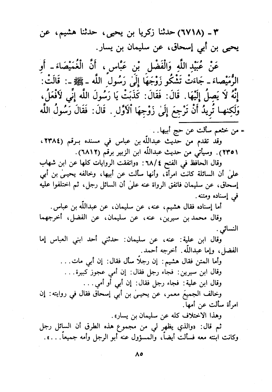 6718 - حَدَّثَنَا زَكَرِيَّا بْنُ يَحْيَى، حَدَّثَنَا هُشَيْمٌ، عَنْ يَحْيَى بْنِ أَبِي إِسْحَاقَ، عَنْ سُلَيْمَانَ بْنِ يَسَارٍ، عَنْ عُبَيْدِ اللَّهِ، وَالْفَضْلِ بْنِ عَبَّاسٍ، أَنَّ الْغُمَيْصَاءَ، - أَوِ الرُّمَيْصَاءَ - جَاءَتْ تَشْكُو زَوْجَهَا إِلَى رَسُولِ اللَّهِ صَلَّى اللهُ عَلَيْهِ وَسَلَّمَ، قَالَتْ: إِنَّهُ لَا يَصِلُ إِلَيْهَا قَالَ: فَقَالَ: كَذَبَتْ يَا رَسُولَ اللَّهِ، إِنِّي لَأَفْعَلُ، وَلَكِنَّهَا تُرِيدُ أَنْ تَرْجِعَ إِلَى زَوْجِهَا الْأَوَّلِ قَالَ: فَقَالَ رَسُولُ اللَّهِ صَلَّى اللهُ عَلَيْهِ وَسَلَّمَ: «§لَا تَحِلُّ لَهُ حَتَّى تَذُوقَ عُسَيْلَتَهَا» Kإسناده صحيح