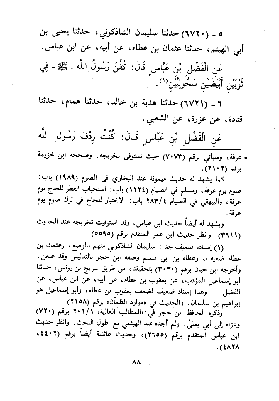 6720 - حَدَّثَنَا سُلَيْمَانُ الشَّاذَكُونِيُّ، حَدَّثَنَا يَحْيَى بْنُ أَبِي الْهَيْثَمِ، حَدَّثَنَا عُثْمَانُ بْنُ عَطَاءٍ، عَنْ أَبِيهِ، عَنِ ابْنِ عَبَّاسٍ، عَنِ الْفَضْلِ بْنِ عَبَّاسٍ قَالَ: «§كُفِّنَ رَسُولُ اللَّهِ صَلَّى اللهُ عَلَيْهِ وَسَلَّمَ فِي ثَوْبَيْنِ أَبْيَضَيْنِ سَحُولِيَّيْنِ» Kإسناده ضعيف جدا