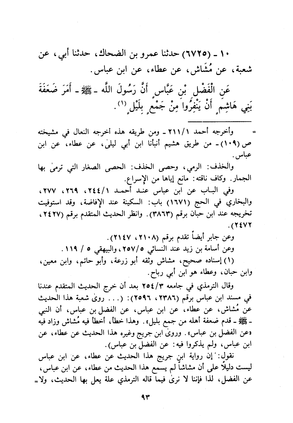 6725 - حَدَّثَنَا عَمْرُو بْنُ الضَّحَّاكِ، حَدَّثَنَا أَبِي، عَنْ شُعْبَةَ، عَنْ مُشَاشٍ، عَنْ عَطَاءٍ، عَنِ ابْنِ عَبَّاسٍ، عَنِ الْفَضْلِ بْنِ عَبَّاسٍ، أَنَّ رَسُولَ اللَّهِ صَلَّى اللهُ عَلَيْهِ وَسَلَّمَ §أَمْرَ ضَعَفَةَ بَنِي هَاشِمٍ أَنْ يَنْفِرُوا مِنْ جَمْعٍ بِلَيْلٍ "Kإسناده صحيح