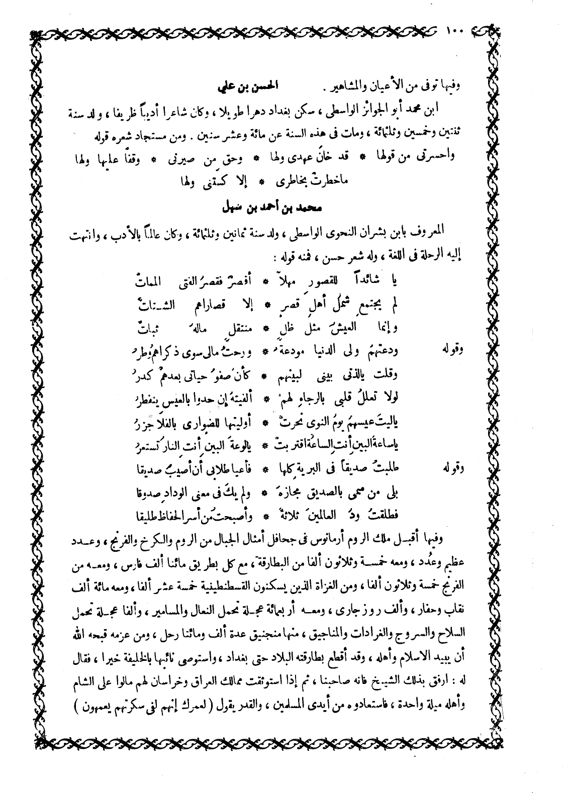 ابن محمد أَبُو الْجَوَائِزِ الْوَاسِطِيُّ، سَكَنَ بَغْدَادَ دَهْرًا طَوِيلًا، وكان شاعرا أديبا ظريفا، ولد سنة ثنتين وَخَمْسِينَ وَثَلَاثِمِائَةٍ، وَمَاتَ فِي هَذِهِ السَّنَةِ عَنْ مِائَةٍ وَعَشْرِ سِنِينَ. وَمِنْ مُسْتَجَادِ شِعْرِهِ قَوْلُهُ