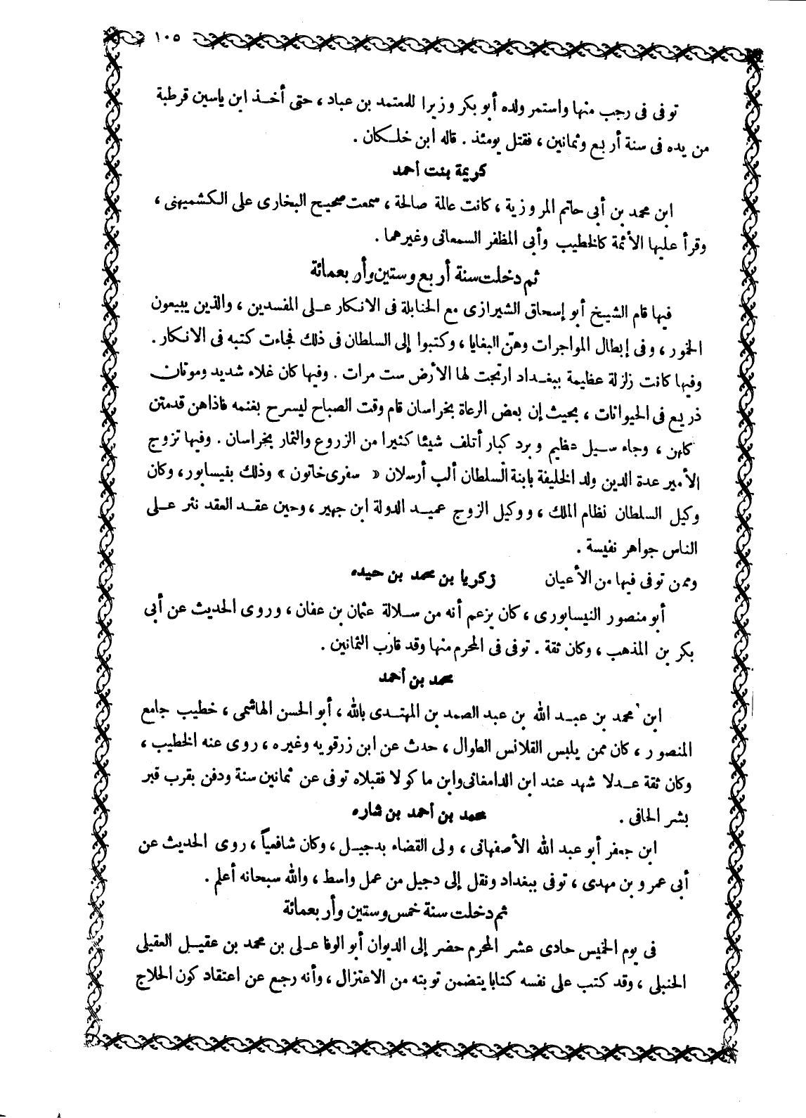 أَبُو مَنْصُورٍ النَّيْسَابُورِيُّ، كَانَ يَزْعُمُ أَنَّهُ مِنْ سُلَالَةِ عُثْمَانَ بْنِ عَفَّانَ، وَرَوَى الْحَدِيثَ عَنْ أَبِي بَكْرِ بْنِ الْمُذْهِبِ، وَكَانَ ثِقَةً. تُوُفِّيَ في المحرم منها وقد قارب الثمانين.