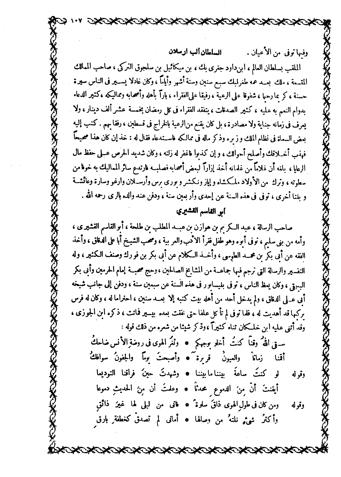 صاحب الرسالة، عبد الكريم بن هوازن بن عبد المطلب بن طلحة، أبو القاسم القشيري، وَأُمُّهُ مِنْ بَنِي سُلَيْمٍ، تُوُفِّيَ أَبُوهُ وَهُوَ طِفْلٌ فَقَرَأَ الْأَدَبَ وَالْعَرَبِيَّةَ، وَصَحِبَ الشَّيْخَ أَبَا عَلِيٍّ الدَّقَّاقَ، وَأَخَذَ الْفِقْهَ عَنْ أَبِي بَكْرِ بن محمد الطوسي، وأخذ الكلام عَنْ أَبِي بَكْرِ بْنِ فُورَكَ وَصَنَّفَ الْكَثِيرَ، وله التفسير والرسالة التي ترجم فيها جماعة من المشايخ الصالحين، وَحَجَّ صُحْبَةَ إِمَامِ الْحَرَمَيْنِ وَأَبِي بَكْرٍ الْبَيْهَقِيِّ، وَكَانَ يَعِظُ النَّاسَ، تُوُفِّيَ بِنَيْسَابُورَ فِي هَذِهِ السَّنَةِ عَنْ سَبْعِينَ سَنَةً، وَدُفِنَ إِلَى جَانِبِ شَيْخِهِ أَبِي عَلِيٍّ الدَّقَّاقِ، وَلَمْ يَدْخُلْ أَحَدٌ من أهله بَيْتَ كُتُبِهِ إِلَّا بَعْدَ سِنِينَ، احْتِرَامًا لَهُ، وكان له فرس يركبها قد أهديت له، فَلَمَّا تُوُفِّيَ لَمْ تَأْكُلْ عَلَفًا حَتَّى نَفَقَتْ بعده بيسير فماتت، ذكره ابن الجوزي، وَقَدْ أَثْنَى عَلَيْهِ ابْنُ خَلِّكَانَ ثَنَاءً كَثِيرًا، وذكر شيئا من شعره من ذَلِكَ قَوْلُهُ: