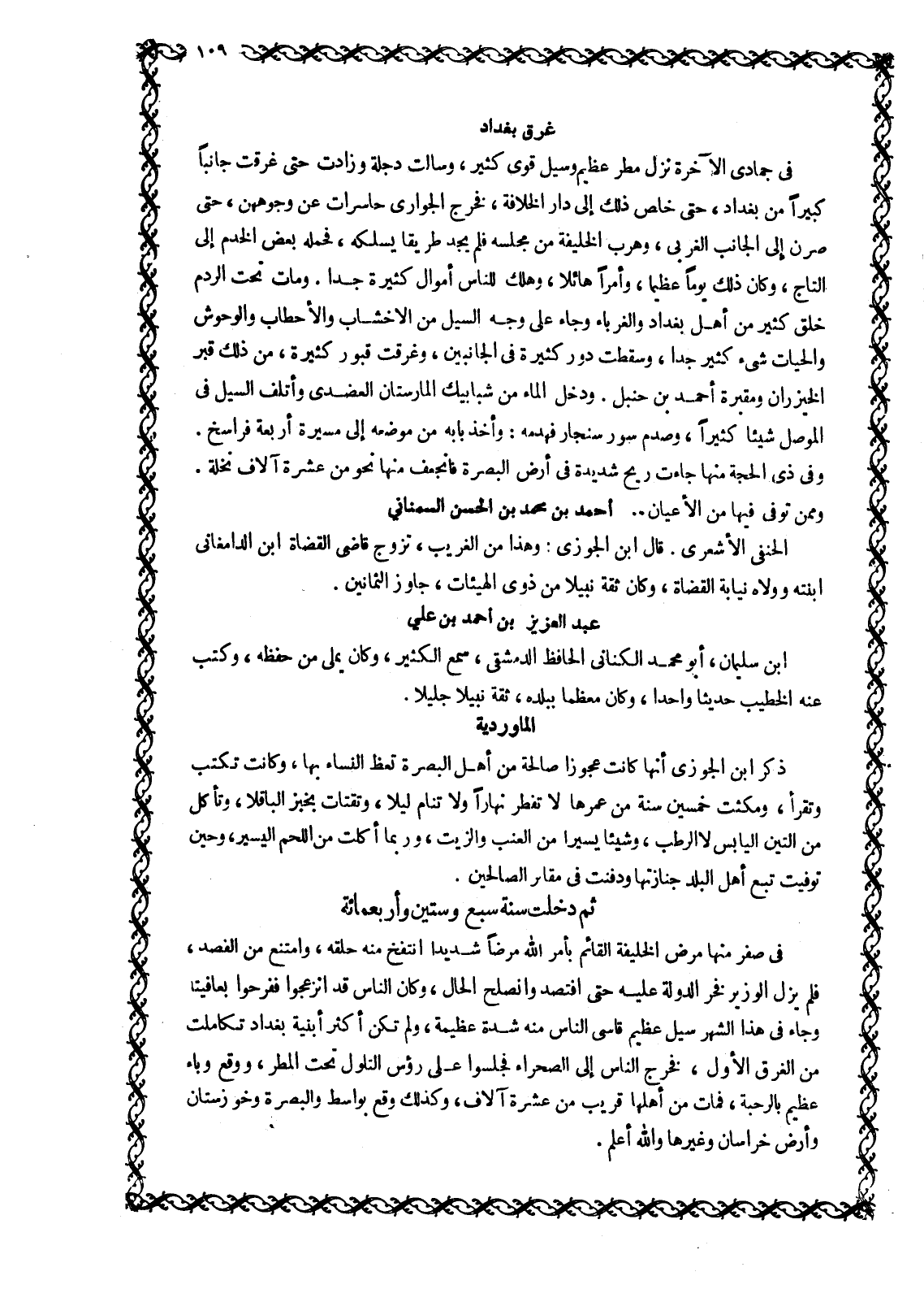 في جمادى الآخرة نزل مطر عظيم وسيل قوى كثير، وسالت دجلة وزادت حَتَّى غَرَّقَتْ جَانِبًا كَبِيرًا مِنْ بَغْدَادَ، حَتَّى خَلَصَ ذَلِكَ إِلَى دَارِ الْخِلَافَةِ، فَخَرَجَ الْجَوَارِي حاسرات عن وجوههن، حَتَّى صِرْنَ إِلَى الْجَانِبِ الْغَرْبِيِّ، وَهَرَبَ الْخَلِيفَةُ مِنْ مَجْلِسِهِ فَلَمْ يَجِدْ طَرِيقًا يَسْلُكُهُ، فَحَمَلَهُ بَعْضُ الْخَدَمِ إِلَى التَّاجِ، وَكَانَ ذَلِكَ يَوْمًا عظيما، وأمرا هائلا، وهلك للناس أموال كثيرة جدا. ومات تحت الدم خلق كثير من أهل بغداد والغرباء وجاء على وجه السيل من الأخشاب والأحطاب وَالْوُحُوشِ وَالْحَيَّاتِ شَيْءٌ كَثِيرٌ جِدًّا، وَسَقَطَتْ دُورٌ كَثِيرَةٌ فِي الْجَانِبَيْنِ، وَغَرِقَتْ قُبُورٌ كَثِيرَةٌ، مِنْ ذلك قبر الخيزران ومقبرة أَحْمَدَ بْنِ حَنْبَلٍ. وَدَخَلَ الْمَاءُ مِنْ شَبَابِيكِ الْمَارَسْتَانِ الْعَضُدِيِّ وَأَتْلَفَ السَّيْلُ فِي الْمَوْصِلِ شَيْئًا كَثِيرًا، وَصَدَمَ سُورَ سِنْجَارَ فَهَدَمَهُ: وَأَخَذَ بَابَهُ مِنْ مَوْضِعِهِ إِلَى مَسِيرَةِ أَرْبَعَةِ فَرَاسِخَ.