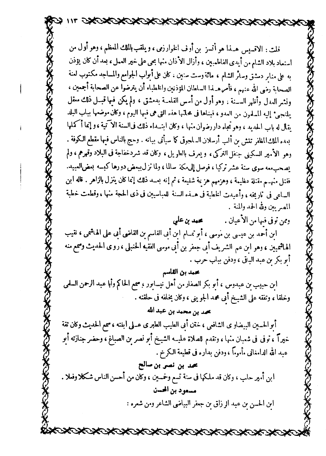 قلت: الاقسيس هذا هو أتسز بن أوف الخوارزمي، ويلقب بالملك المعظم، وهو أول من استعاد بلاد الشام من أيدي الفاطميين، وأزال الأذان منها بحي على خير العمل، بعد أن كان يؤذن به على منابر دمشق وسائر الشام، مائة وست سنين، كان على أبواب الجوامع والمساجد مكتوب لعنة الصحابة رضى الله عنهم، فأمر هذا السلطان المؤذنين والخطباء أن يترضوا عن الصحابة أجمعين، ونشر العدل وأظهر السنة. وهو أول من أسس القلعة بدمشق، ولم يكن فيها قبل ذلك معقل يلتجئ إليه المسلمون من العدو، فبناها في محلتها هذه التي هي فيها اليوم، وكان موضعها بباب البلد يقال له باب الحديد، وهو تجاه دار رضوان منها، وكان ابتداء ذلك في السنة الآتية، وإنما أكملها بعده الملك المظفر تنش بن ألب أرسلان السلجوقي كما سيأتي بيانه. وحج بالناس فيها مقطع الكوفة.