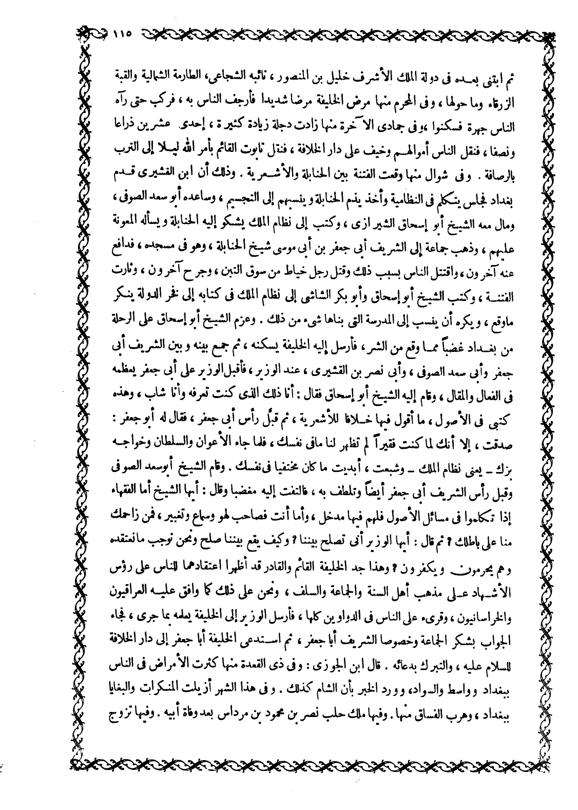 صَدَقْتَ، إِلَّا أَنَّكَ لَمَّا كُنْتَ فَقِيرًا لَمْ تُظْهِرْ لَنَا مَا في نفسك، فلما جاء الأعوان والسلطان وخواجه بزرك- يعنى نظام الملك- وشبعت، أَبْدَيْتَ مَا كَانَ مُخْتَفِيًا فِي نَفْسِكَ. وَقَامَ الشيخ أبو سعد الصوفي وقبل رَأْسَ الشَّرِيفِ أَبِي جَعْفَرٍ أَيْضًا وَتَلَطَّفَ بِهِ، فَالْتَفَتَ إِلَيْهِ مُغْضَبًا وَقَالَ: أَيُّهَا الشَّيْخُ أَمَّا الْفُقَهَاءُ إِذَا تَكَلَّمُوا فِي مَسَائِلِ الْأُصُولِ فَلَهُمْ فِيهَا مَدْخَلٌ، وَأَمَّا أَنْتَ فَصَاحِبُ لَهْوٍ وَسَمَاعٍ وتغيير، فَمَنْ زَاحَمَكَ مِنَّا عَلَى بَاطِلِكَ؟ ثُمَّ قَالَ: أيها الوزير أنى تصلح بيننا؟ وكيف يقع بيننا صلح ونحن نوجب ما نعتقده وهم يحرمون ويكفرون؟ وَهَذَا جَدُّ الْخَلِيفَةِ الْقَائِمُ وَالْقَادِرُ قَدْ أَظْهَرَا اعْتِقَادَهُمَا لِلنَّاسِ عَلَى رُءُوسِ الْأَشْهَادِ عَلَى مَذْهَبِ أَهْلِ السُّنَّةِ وَالْجَمَاعَةِ وَالسَّلَفِ، وَنَحْنُ عَلَى ذَلِكَ كَمَا وَافَقَ عَلَيْهِ الْعِرَاقِيُّونَ وَالْخُرَاسَانِيُّونَ، وَقُرِئَ عَلَى النَّاسِ فِي الدَّوَاوِينِ كُلِّهَا، فَأَرْسَلَ الْوَزِيرُ إِلَى الْخَلِيفَةِ يُعْلِمُهُ بِمَا جَرَى، فَجَاءَ الْجَوَابُ بِشُكْرِ الْجَمَاعَةِ وَخُصُوصًا الشَّرِيفَ أَبَا جَعْفَرٍ، ثُمَّ اسْتُدْعِيَ الخليفة أبا جعفر إِلَى دَارِ الْخِلَافَةِ لِلسَّلَامِ عَلَيْهِ، وَالتَّبَرُّكِ بِدُعَائِهِ. قَالَ ابْنُ الْجَوْزِيِّ: وَفَى ذِي الْقَعْدَةِ مِنْهَا كَثُرَتِ الْأَمْرَاضُ فِي النَّاسِ بِبَغْدَادَ وَوَاسِطٍ وَالسَّوَادِ، وَوَرَدَ الْخَبَرُ بِأَنَّ الشَّامَ كَذَلِكَ. وَفِي هَذَا الشَّهْرِ أُزِيلَتِ الْمُنْكَرَاتُ وَالْبَغَايَا بِبَغْدَادَ، وَهَرَبَ الْفُسَّاقُ مِنْهَا. وَفِيهَا مَلَكَ حَلَبَ نَصْرُ بْنُ مَحْمُودِ بْنِ مِرْدَاسٍ بَعْدَ وَفَاةِ أَبِيهِ. وَفِيهَا تَزَوَّجَ
