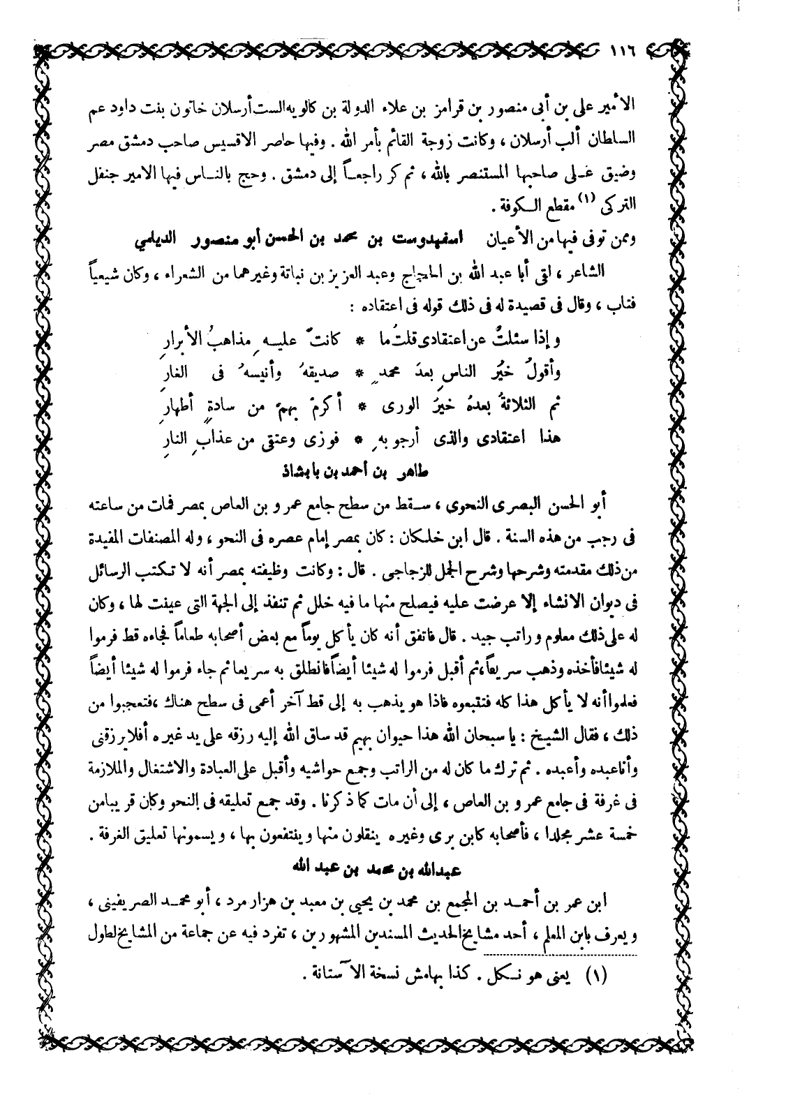 أبو الحسن البصري النَّحْوِيُّ، سَقَطَ مِنْ سَطْحِ جَامِعِ عَمْرِو بْنِ العاص بمصر فمات من ساعته فِي رَجَبٍ مِنْ هَذِهِ السَّنَةِ. قَالَ ابْنُ خَلِّكَانَ: كَانَ بِمِصْرَ إِمَامُ عَصْرِهِ فِي النَّحْوِ، وله المصنفات المفيدة من ذلك مقدمته وشرحها وشرح الْجُمَلِ لِلزَّجَّاجِىِّ. قَالَ: وَكَانَتْ وَظِيفَتُهُ بِمِصْرَ أَنَّهُ لَا تُكْتَبُ الرَّسَائِلُ فِي دِيوَانِ الْإِنْشَاءِ إِلَّا عُرِضَتْ عَلَيْهِ فَيُصْلِحُ مِنْهَا مَا فِيهِ خَلَلٌ ثُمَّ تُنْفَذُ إِلَى الْجِهَةِ الَّتِي عُيِّنَتْ لَهَا، وَكَانَ لَهُ عَلَى ذَلِكَ مَعْلُومٌ وَرَاتِبٌ جَيِّدٌ. قَالَ فَاتَّفَقَ أَنَّهُ كَانَ يَأْكُلُ يَوْمًا مَعَ بَعْضِ أَصْحَابِهِ طَعَامًا فَجَاءَهُ قِطٌّ فَرَمَوْا لَهُ شَيْئًا فَأَخَذَهُ وَذَهَبَ سَرِيعًا، ثُمَّ أَقْبَلَ فَرَمَوْا لَهُ شَيْئًا أَيْضًا فَانْطَلَقَ بِهِ سَرِيعًا ثُمَّ جَاءَ فَرَمَوْا لَهُ شَيْئًا أَيْضًا فَعَلِمُوا أَنَّهُ لَا يَأْكُلُ هَذَا كُلَّهُ فَتَتَبَّعُوهُ فَإِذَا هُوَ يَذْهَبُ بِهِ إِلَى قِطٍّ آخَرَ أَعْمَى فِي سَطْحٍ هُنَاكَ، فَتَعَجَّبُوا مِنْ ذَلِكَ، فَقَالَ الشَّيْخُ: يَا سُبْحَانَ اللَّهِ هَذَا حَيَوَانٌ بَهِيمٌ قَدْ سَاقَ اللَّهُ إِلَيْهِ رِزْقَهُ عَلَى يَدِ غَيْرِهِ أفلا يرزقني وأنا عبده وأعبده. ثُمَّ تَرَكَ مَا كَانَ لَهُ مِنَ الرَّاتِبِ وَجَمَعَ حَوَاشِيَهُ وَأَقْبَلَ عَلَى الْعِبَادَةِ وَالِاشْتِغَالِ وَالْمُلَازَمَةِ فِي غُرْفَةٍ فِي جَامِعِ عَمْرِو بْنِ الْعَاصِ، إلى أن مات كما ذكرنا. وقد جمع تعليقه في النحو وكان قَرِيبًا مِنْ خَمْسَةَ عَشَرَ مُجَلَّدًا، فَأَصْحَابُهُ كَابْنِ بَرِيٍّ وَغَيْرِهِ يَنْقُلُونَ مِنْهَا وَيَنْتَفِعُونَ بِهَا، وَيُسَمُّونَهَا تَعْلِيقَ الْغُرْفَةِ.