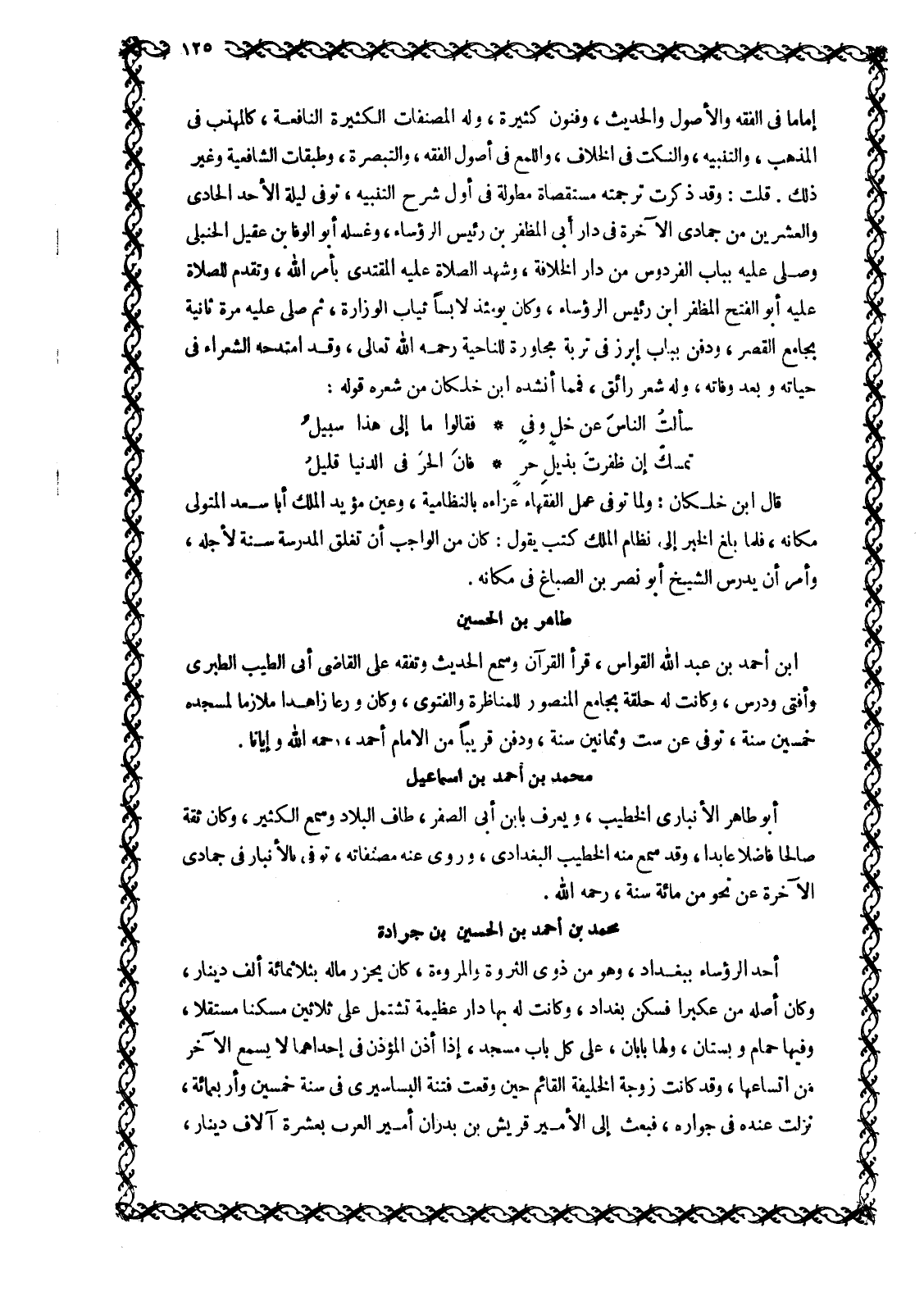 إِمَامًا فِي الْفِقْهِ وَالْأُصُولِ وَالْحَدِيثِ، وَفُنُونٍ كَثِيرَةٍ، وله المصنفات الكثيرة النافعة، كالمهذب في المذهب، والتنبيه، والنكت في الخلاف، واللمع في أصول الفقه، والتبصرة، وطبقات الشافعية وَغَيْرِ ذَلِكَ. قُلْتُ: وَقَدْ ذَكَرْتُ تَرْجَمَتُهُ مُسْتَقْصَاةً مطولة فِي أَوَّلِ شَرْحِ التَّنْبِيهِ، تُوُفِّيَ لَيْلَةَ الْأَحَدِ الْحَادِي وَالْعِشْرِينَ مِنْ جُمَادَى الْآخِرَةِ فِي دَارِ أبى المظفر بن رَئِيسِ الرُّؤَسَاءِ، وَغَسَّلَهُ أَبُو الْوَفَا بْنُ عَقِيلٍ الْحَنْبَلِيُّ وَصُلِّيَ عَلَيْهِ بِبَابِ الْفِرْدَوْسِ مِنْ دَارِ الْخِلَافَةِ، وَشَهِدَ الصَّلَاةَ عَلَيْهِ الْمُقْتَدِي بِأَمْرِ اللَّهِ، وَتَقَدَّمَ لِلصَّلَاةِ عَلَيْهِ أَبُو الْفَتْحِ الْمُظَفَّرُ ابْنُ رئيس الرؤساء، وكان يومئذ لابسا ثياب الْوَزَارَةِ، ثُمَّ صُلِّيَ عَلَيْهِ مَرَّةً ثَانِيَةً بِجَامِعِ الْقَصْرِ، وَدُفِنَ بِبَابِ أَبْرَزَ فِي تُرْبَةٍ مُجَاوِرَةٍ لِلنَّاحِيَةِ رَحِمَهُ اللَّهُ تَعَالَى، وَقَدِ امْتَدَحَهُ الشُّعَرَاءُ في حياته وبعد وفاته، وله شِعْرٌ رَائِقٌ، فَمِمَّا أَنْشَدَهُ ابْنُ خَلِّكَانَ مِنْ شَعْرِهِ قَوْلُهُ: