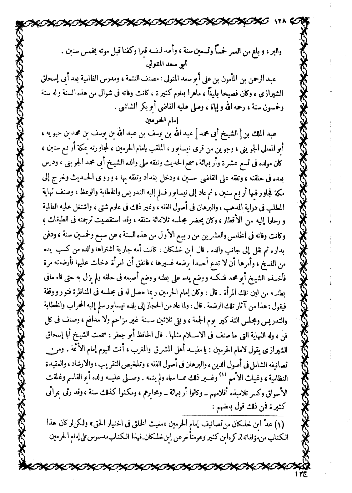 عبد الملك بن [الشيخ أَبِي مُحَمَّدٍ] عَبْدُ اللَّهِ بْنُ يُوسُفَ بْنِ عَبْدِ اللَّهِ بْنِ يُوسُفَ بْنِ مُحَمَّدِ بْنِ حَيُّوَيَهِ، أَبُو الْمَعَالِي الْجُوَيْنِيُّ، وَجُوَيْنُ مِنْ قُرَى نَيْسَابُورَ، الْمُلَقَّبُ بِإِمَامِ الْحَرَمَيْنِ، لِمُجَاوَرَتِهِ بِمَكَّةَ أَرْبَعَ سِنِينَ، كان مولده في تِسْعَ عَشْرَةَ وَأَرْبَعِمِائَةٍ، سَمِعَ الْحَدِيثَ وَتَفَقَّهَ عَلَى وَالِدِهِ الشَّيْخِ أَبِي مُحَمَّدٍ الْجُوَيْنِيِّ، وَدَرَّسَ بَعْدَهُ فِي حَلْقَتِهِ، وَتَفَقَّهَ عَلَى الْقَاضِي حُسَيْنٍ، وَدَخَلَ بغداد وتفقه بها، وروى الْحَدِيثَ وَخَرَجَ إِلَى مَكَّةَ فَجَاوَرَ فِيهَا أَرْبَعَ سِنِينَ، ثُمَّ عَادَ إِلَى نَيْسَابُورَ فَسُلِّمَ إِلَيْهِ التَّدْرِيسُ وَالْخَطَابَةُ وَالْوَعْظُ، وَصَنَّفَ نِهَايَةَ الْمَطْلَبِ فِي دِرَايَةِ الْمَذْهَبِ، وَالْبُرْهَانَ فِي أُصُولِ الْفِقْهِ، وَغَيْرَ ذلك في عُلُومٍ شَتَّى، وَاشْتَغَلَ عَلَيْهِ الطَّلَبَةُ وَرَحَلُوا إِلَيْهِ مِنَ الْأَقْطَارِ، وَكَانَ يَحْضُرُ مَجْلِسَهُ ثَلَاثُمِائَةِ مُتَفَقِّهٍ، وَقَدِ اسْتَقْصَيْتُ تَرْجَمَتَهُ فِي الطَّبَقَاتِ، وَكَانَتْ وَفَاتُهُ في الخامس وَالْعِشْرِينَ مِنْ رَبِيعٍ الْأَوَّلِ مِنْ هَذِهِ السَّنَةِ، عَنْ سَبْعٍ وَخَمْسِينَ سَنَةً، وَدُفِنَ بِدَارِهِ ثُمَّ نقل إلى جانب والده. قَالَ ابْنُ خَلِّكَانَ: كَانَتْ أُمُّهُ جَارِيَةً اشْتَرَاهَا وَالِدُهُ مِنْ كَسْبِ يَدِهِ مِنَ النَّسْخِ، وَأَمَرَهَا أن لا تدع أحدا يُرْضِعَهُ غَيْرُهَا، فَاتَّفَقَ أَنَّ امْرَأَةً دَخَلَتْ عَلَيْهَا فَأَرْضَعَتْهُ مَرَّةً فَأَخَذَهُ الشَّيْخُ أَبُو مُحَمَّدٍ فَنَكَسَهُ وَوَضَعَ يَدَهُ عَلَى بَطْنِهِ وَوَضَعَ أُصْبُعَهُ فِي حلقه ولم يزل به حتى قاء ما فِي بَطْنِهِ مِنْ لَبَنِ تِلْكَ الْمَرْأَةِ. قَالَ: وكان إمام الحرمين ربما حصل له في مجلسه في المناظرة فتور ووقفة فَيَقُولُ: هَذَا مِنْ آثَارِ تِلْكَ الرَّضْعَةِ. قَالَ: وَلَمَّا عَادَ مِنَ الْحِجَازِ إِلَى بَلَدِهِ نَيْسَابُورَ سلم إليه المحراب وَالْخَطَابَةُ وَالتَّدْرِيسُ وَمَجْلِسُ التَّذْكِيرِ يَوْمَ الْجُمُعَةِ، وَبَقِيَ ثَلَاثِينَ سَنَةً غَيْرَ مُزَاحَمٍ وَلَا مُدَافَعٍ، وَصَنَّفَ في كل فن، وله النهاية التي ما صنف في الإسلام مثلها. قَالَ الْحَافِظُ أَبُو جَعْفَرٍ: سَمِعْتُ الشَّيْخَ أَبَا إِسْحَاقَ الشِّيرَازِيَّ يَقُولُ لِإِمَامِ الْحَرَمَيْنِ: يَا مُفِيدَ أَهْلِ الْمَشْرِقِ وَالْمَغْرِبِ، أَنْتَ الْيَوْمَ إِمَامُ الْأَئِمَّةِ. ومن تصانيفه الشامل في أصول الدين، والبرهان في أصول الفقه، وتلخيص التقريب، والإرشاد، والعقيدة النظامية، وغياث الأمم [1] وغير ذلك مما سماه ولم يتمه. وصلى عَلَيْهِ وَلَدُهُ أَبُو الْقَاسِمِ وَغُلِّقَتِ الْأَسْوَاقُ وَكَسَرَ تلاميذه أقلامهم- وكانوا أربعمائة- ومحابرهم، ومكثوا كذلك سنة، وقد رثى بمراثي كثيرة فمن ذلك قول بعضهم:
