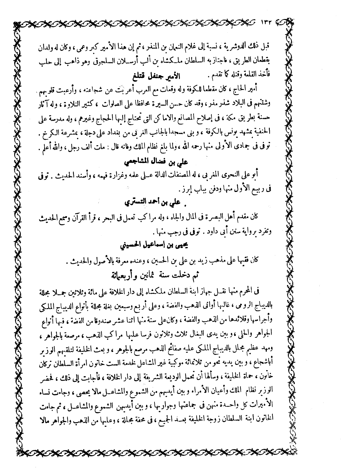 فِي الْمُحَرَّمِ مِنْهَا نُقِلَ جَهَازُ ابْنَةِ السُّلْطَانِ ملك شاه إِلَى دَارِ الْخِلَافَةِ عَلَى مِائَةٍ وَثَلَاثِينَ جَمَلًا مُجَلَّلَةً بِالدِّيبَاجِ الرُّومِيِّ، غَالِبُهَا أَوَانِي الذَّهَبِ وَالْفِضَّةِ، وَعَلَى أَرْبَعٍ وَسَبْعِينَ بَغْلَةً مُجَلَّلَةً بِأَنْوَاعِ الدِّيبَاجِ الملكي وأجراسها وقلائدها من الذهب والفضة، وَكَانَ عَلَى سِتَّةٍ مِنْهَا اثْنَا عَشَرَ صُنْدُوقًا من الفضة، فيها أنواع الجواهر والحلي، وَبَيْنَ يَدَيِ الْبِغَالِ ثَلَاثٌ وَثَلَاثُونَ فَرَسًا عَلَيْهَا مراكب الذهب، مرصعة بالجواهر، وَمَهْدٌ عَظِيمٌ مُجَلَّلٌ بِالدِّيبَاجِ الْمَلَكِيِّ عَلَيْهِ صَفَائِحُ الذَّهَبِ مُرَصَّعٌ بِالْجَوْهَرِ، وَبَعَثَ الْخَلِيفَةُ لِتَلَقِّيهِمْ الْوَزِيرَ أَبَا شُجَاعٍ، وَبَيْنَ يَدَيْهِ نَحْوٌ مِنْ ثَلَاثِمِائَةٍ مَوْكَبِيَّةٍ غَيْرَ الْمَشَاعِلِ لِخِدْمَةِ السِّتِّ خَاتُونَ امْرَأَةِ السُّلْطَانِ تُرْكَانَ خَاتُونَ، حَمَاةِ الْخَلِيفَةِ، وَسَأَلَهَا أَنْ تَحْمِلَ الْوَدِيعَةَ الشَّرِيفَةَ إِلَى دَارِ الْخِلَافَةِ، فَأَجَابَتْ إِلَى ذَلِكَ، فَحَضَرَ الْوَزِيرُ نِظَامُ الْمُلْكِ وَأَعْيَانُ الْأُمَرَاءِ وَبَيْنَ أَيْدِيهِمْ مِنَ الشُّمُوعِ وَالْمَشَاعِلِ مَا لا يحصى، وجاءت نساء الأميرات كُلُّ وَاحِدَةٍ مِنْهُنَّ فِي جَمَاعَتِهَا وَجَوَارِيهَا، وَبَيْنَ أَيْدِيهِنَّ الشُّمُوعُ وَالْمَشَاعِلُ، ثُمَّ جَاءَتِ الْخَاتُونَ ابْنَةُ السُّلْطَانِ زَوْجَةُ الْخَلِيفَةِ بَعْدَ الْجَمِيعِ، فِي مِحَفَّةٍ مجللة، وعليها من الذهب والجواهر مالا