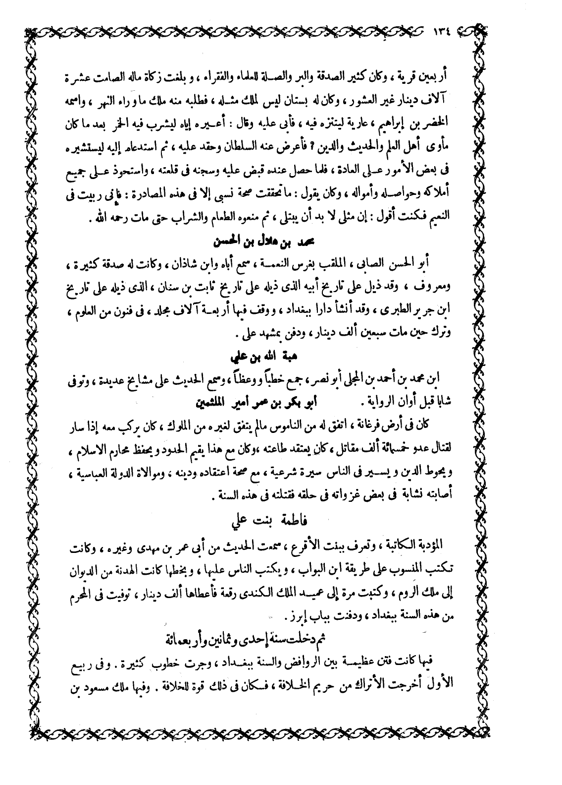 أبو الحسن الصابي، الملقب بغرس النعمة، سمع أباه وابن شَاذَانَ، وَكَانَتْ لَهُ صَدَقَةٌ كَثِيرَةٌ، وَمَعْرُوفٌ، وَقَدْ ذَيَّلَ عَلَى تَارِيخِ أَبِيهِ الَّذِي ذَيَّلَهُ عَلَى تَارِيخِ ثَابِتِ بْنِ سِنَانٍ، الَّذِي ذَيَّلَهُ عَلَى تَارِيخِ ابْنِ جَرِيرٍ الطَّبَرِيِّ، وَقَدْ أَنْشَأَ دَارًا بِبَغْدَادَ، وَوَقَفَ فِيهَا أَرْبَعَةَ آلَافِ مُجَلَّدٍ، فِي فُنُونٍ مِنَ الْعُلُومِ، وَتَرَكَ حِينَ مَاتَ سَبْعِينَ ألف دينار، ودفن بمشهد على.