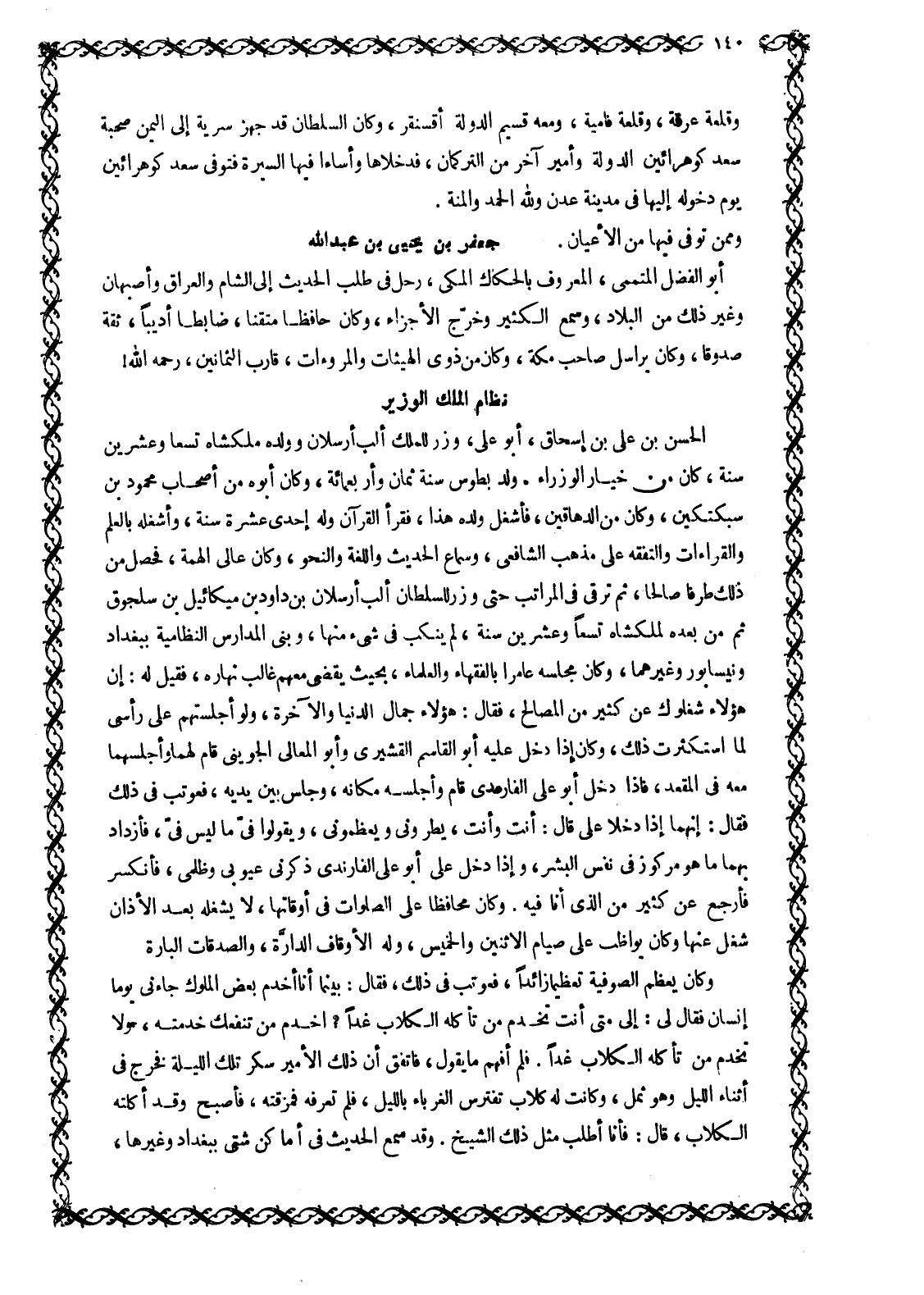 الحسن بن على بن إسحاق، أبو على، وزر للملك ألب أرسلان وولده ملك شاه تِسْعًا وَعِشْرِينَ سَنَةً، كَانَ مِنْ خِيَارِ الْوُزَرَاءِ، ولد بطوس سنة ثمان وأربعمائة، وكان أبوه من أَصْحَابَ مَحْمُودِ بْنِ سُبُكْتِكِينَ، وَكَانَ مِنَ الدَّهَاقِينِ، فأشغل ولده هذا، فقرأ القرآن وله إحدى عشرة سنة، وأشغله بالعلم والقراءات وَالتَّفَقُّهِ عَلَى مَذْهَبِ الشَّافِعِيِّ، وَسَمَاعِ الْحَدِيثِ وَاللُّغَةِ وَالنَّحْوِ، وَكَانَ عَالِيَ الْهِمَّةِ، فَحَصَّلَ مِنْ ذَلِكَ طَرَفًا صَالِحًا، ثُمَّ تَرَقَّى فِي الْمَرَاتِبِ حَتَّى وَزَرَ لِلسُّلْطَانِ أَلْبِ أَرْسَلَانَ بْنِ دَاوُدَ بْنِ ميكائيل بن سلجوق ثم من بعده لملكشاه تسعا وعشرين سنة، لَمْ يُنْكَبْ فِي شَيْءٍ مِنْهَا، وَبَنَى الْمَدَارِسَ النظامية بِبَغْدَادَ وَنَيْسَابُورَ وَغَيْرِهِمَا، وَكَانَ مَجْلِسُهُ عَامِرًا بِالْفُقَهَاءِ والعلماء، بحيث يقضى معهم غالب نهاره، فَقِيلَ لَهُ: إِنَّ هَؤُلَاءِ شَغَلُوكَ عَنْ كَثِيرٍ مِنَ الْمَصَالِحِ، فَقَالَ: هَؤُلَاءِ جَمَالُ الدُّنْيَا وَالْآخِرَةِ، ولو أجلستهم على رأسي لما اسْتَكْثَرْتُ ذَلِكَ، وَكَانَ إِذَا دَخَلَ عَلَيْهِ أَبُو الْقَاسِمِ الْقُشَيْرِيُّ وَأَبُو الْمَعَالِي الْجُوَيْنِيُّ قَامَ لَهُمَا وأجلسهما معه في المقعد، فإذا دخل أبو على الفارندى قَامَ وَأَجْلَسَهُ مَكَانَهُ، وَجَلَسَ بَيْنَ يَدَيْهِ، فَعُوتِبَ فِي ذَلِكَ فَقَالَ: إِنَّهُمَا إِذَا دَخَلَا عَلَيَّ قال: أنت وأنت، يطرونى ويعظموني، ويقولوا فىّ ما ليس فىّ، فأزداد بهما ما هو مركوز في نفس البشر، وإذا دخل على أبو على الفارندى ذكرني عيوبي وظلمي، فأنكسر فأرجع عَنْ كَثِيرٍ مِنَ الَّذِي أَنَا فِيهِ. وَكَانَ مُحَافِظًا عَلَى الصَّلَوَاتِ فِي أَوْقَاتِهَا، لَا يَشْغَلُهُ بَعْدَ الْأَذَانِ شُغْلٌ عَنْهَا وَكَانَ يُوَاظِبُ عَلَى صِيَامِ الْاثْنَيْنِ وَالْخَمِيسِ، وَلَهُ الْأَوْقَافُ الدَّارَّةُ، وَالصَّدَقَاتُ الْبَارَّةُ وَكَانَ يُعَظِّمُ الصُّوفِيَّةَ تَعْظِيمًا زَائِدًا، فَعُوتِبَ في ذلك، فقال: بينما أنا أخدم بعض الملوك جاءني يوما إنسان فقال لي: إلى متى أنت تخدم من تأكله الكلاب غدا؟ اخْدُمْ مَنْ تَنْفَعُكَ خِدْمَتُهُ، وَلَا تَخْدُمْ مَنْ تَأْكُلُهُ الْكِلَابُ غَدًا. فَلَمْ أَفْهَمْ مَا يَقُولُ، فَاتَّفَقَ أَنَّ ذَلِكَ الْأَمِيرَ سَكِرَ تِلْكَ اللَّيْلَةَ فَخَرَجَ فِي أَثْنَاءِ اللَّيْلِ وَهُوَ ثَمِلٌ، وَكَانَتْ لَهُ كِلَابٌ تَفْتَرِسُ الْغُرَبَاءَ بِاللَّيْلِ، فَلَمْ تَعْرِفْهُ فمزقته، فَأَصْبَحَ وَقَدْ أَكَلَتْهُ الْكِلَابُ، قَالَ: فَأَنَا أَطْلُبُ مثل ذلك الشيخ. وقد سمع الْحَدِيثَ فِي أَمَاكِنَ شَتَّى بِبَغْدَادَ وَغَيْرِهَا،