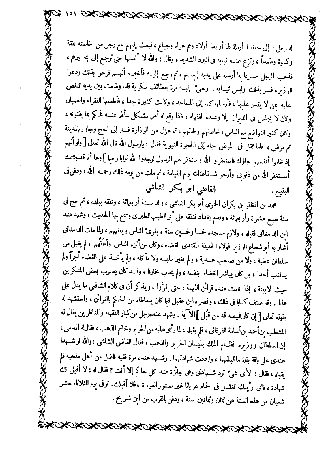 مُحَمَّدُ بْنُ الْمُظَفَّرِ بْنِ بَكْرَانَ الْحَمَوِيُّ أَبُو بكر الشاشي، وُلِدَ سَنَةَ أَرْبَعِمِائَةٍ، وَتَفَقَّهَ بِبَلَدِهِ، ثُمَّ حَجَّ فِي سَنَةِ سَبْعَ عَشْرَةَ وَأَرْبَعِمِائَةٍ، وَقَدِمَ بَغْدَادَ فتفقه على أَبِي الطَّيِّبِ الطَّبَرِيِّ وَسَمِعَ بِهَا الْحَدِيثَ، وَشَهِدَ عِنْدَ ابْنِ الدَّامَغَانِيِّ فَقَبِلَهُ، وَلَازَمَ مَسْجِدَهُ خَمْسًا وَخَمْسِينَ سَنَةً، يُقْرِئُ النَّاسَ وَيُفَقِّهُهُمْ، وَلَمَّا مَاتَ الدَّامَغَانِيُّ أَشَارَ بِهِ أَبُو شُجَاعٍ الْوَزِيرُ فَوَلَّاهُ الْخَلِيفَةُ الْمُقْتَدِي الْقَضَاءَ، وَكَانَ مِنْ أَنْزَهِ النَّاسِ وَأَعَفِّهِمْ، لَمْ يَقْبَلْ مِنْ سُلْطَانٍ عَطِيَّةً، وَلَا مِنْ صَاحِبٍ هَدِيَّةً، وَلَمْ يُغَيِّرْ مَلْبَسَهُ وَلَا مَأْكَلَهُ، وَلَمْ يَأْخُذْ عَلَى الْقَضَاءِ أَجْرًا وَلَمْ يَسْتَنِبْ أَحَدًا، بَلْ كَانَ يُبَاشِرُ الْقَضَاءَ بِنَفْسِهِ، وَلَمْ يُحَابِ مَخْلُوقًا، وَقَدْ كَانَ يَضْرِبُ بَعْضَ الْمُنْكِرِينَ حَيْثُ لَا بَيِّنَةَ، إِذَا قَامَتْ عِنْدَهُ قرائن التهمة، حَتَّى يُقِرُّوا، وَيَذْكُرُ أَنَّ فِي كَلَامِ الشَّافِعِيِّ ما يدل على هذا. وقد صنف كتابا فِي ذَلِكَ، وَنَصَرَهُ ابْنُ عَقِيلٍ فِيمَا كَانَ يَتَعَاطَاهُ مِنَ الْحُكْمِ بِالْقَرَائِنِ، وَاسْتَشْهَدَ لَهُ بِقَوْلِهِ تَعَالَى (إِنْ كانَ قَمِيصُهُ قُدَّ مِنْ قُبُلٍ) 12: 26 الآية. وَشَهِدَ عِنْدَهُ رَجُلٌ مِنْ كِبَارِ الْفُقَهَاءِ وَالْمُنَاظِرِينَ يقال له المشطب بن أحمد بْنِ أُسَامَةَ الْفَرْغَانِيُّ، فَلَمْ يَقْبَلْهُ، لَمَّا رَأَى عَلَيْهِ مِنَ الْحَرِيرِ وَخَاتَمِ الذَّهَبِ، فَقَالَ لَهُ الْمُدَّعِي: