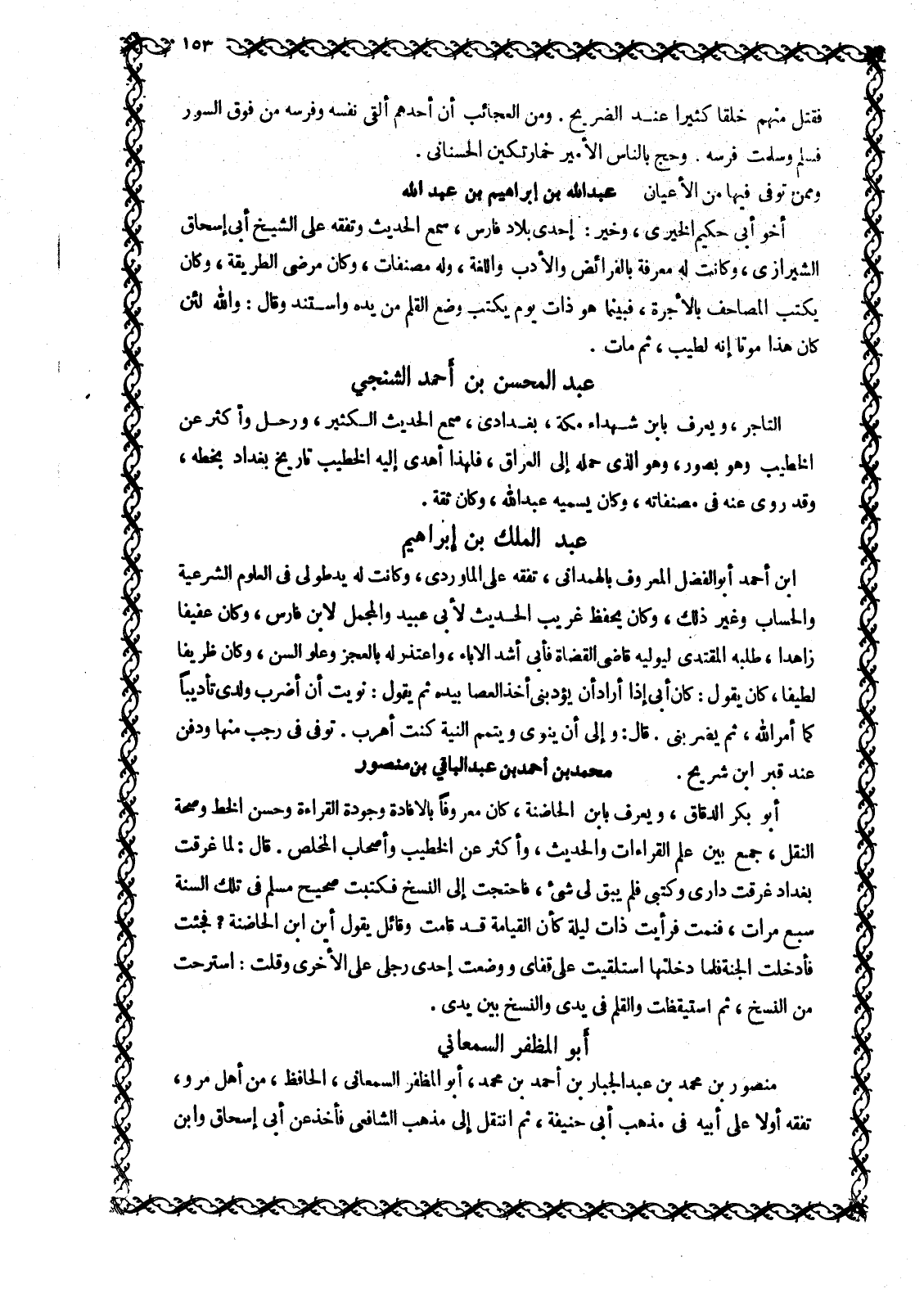 مَنْصُورُ بْنُ مُحَمَّدِ بْنِ عَبْدِ الْجَبَّارِ بْنِ أَحْمَدَ بْنِ مُحَمَّدِ، أَبُو الْمُظَفَّرِ السَّمْعَانِيُّ، الْحَافِظُ، مِنْ أَهْلِ مَرْوَ، تَفَقَّهَ أَوَّلًا عَلَى أَبِيهِ فِي مَذْهَبِ أَبِي حَنِيفَةَ، ثُمَّ انْتَقَلَ إِلَى مذهب الشافعيّ فأخذ عن أبى إسحاق وابن
