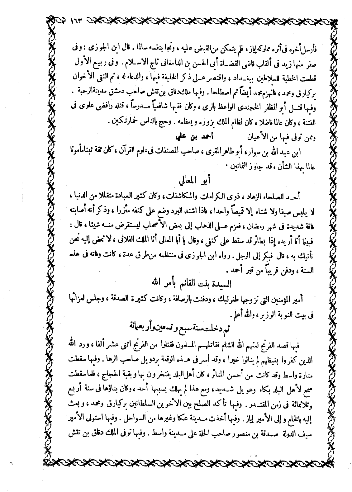 أمير المؤمنين التي تزوجها طغرلبك، ودفنت بالرصافة، وكانت كثيرة الصدقة، وَجَلَسَ لِعَزَائِهَا فِي بَيْتِ النُّوبَةِ الْوَزِيرُ، وَاللَّهُ أَعْلَمُ.