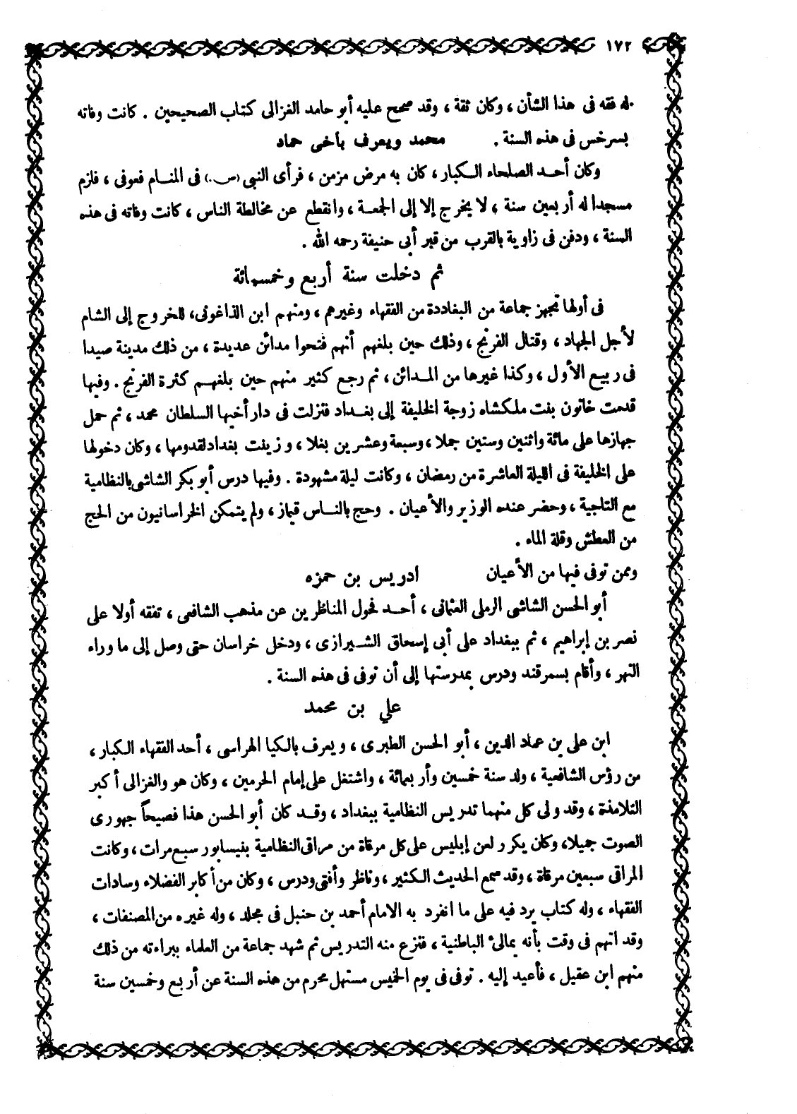ابن عَلِيِّ بْنِ عِمَادِ الدِّينِ، أَبُو الْحَسَنِ الطَّبَرِيُّ، وَيُعْرَفُ بِإِلْكِيَا الْهَرَّاسِيِّ، أَحَدُ الْفُقَهَاءِ الْكِبَارِ، مِنْ رُءُوسِ الشَّافِعِيَّةِ، وُلِدَ سَنَةَ خَمْسِينَ وَأَرْبَعِمَائَةٍ، وَاشْتَغَلَ عَلَى إِمَامِ الْحَرَمَيْنِ، وَكَانَ هُوَ وَالْغَزَّالِيُّ أَكْبَرَ التَّلَامِذَةِ، وَقَدْ وَلِيَ كُلٌّ مِنْهُمَا تَدْرِيسَ النِّظَامِيَّةِ بِبَغْدَادَ، وَقَدْ كَانَ أَبُو الْحَسَنِ هَذَا فَصِيحًا جهوريّ الصوت جميلا، وكان يكرر لعن إبليس على كل مرقاة من مراقى النِّظَامِيَّةِ بِنَيْسَابُورَ سَبْعَ مَرَّاتٍ، وَكَانَتِ الْمَرَاقِي سَبْعِينَ مَرْقَاةً، وَقَدْ سَمِعَ الْحَدِيثَ الْكَثِيرَ، وَنَاظَرَ وَأَفْتَى ودرس، وكان من أكابر الفضلاء وَسَادَاتِ الْفُقَهَاءِ، وَلَهُ كِتَابٌ يَرُدُّ فِيهِ عَلَى مَا انْفَرَدَ بِهِ الْإِمَامُ أَحْمَدُ بْنُ حَنْبَلٍ فِي مُجَلَّدٍ، وَلَهُ غَيْرُهُ مِنَ الْمُصَنَّفَاتِ، وَقَدِ انهم فِي وَقْتٍ بِأَنَّهُ يُمَالِئُ الْبَاطِنِيَّةَ، فَنُزِعَ مِنْهُ التَّدْرِيسُ ثُمَّ شَهِدَ جَمَاعَةٌ مِنَ الْعُلَمَاءِ بِبَرَاءَتِهِ مِنْ ذَلِكَ مِنْهُمُ ابْنُ عَقِيلٍ، فَأُعِيدَ إِلَيْهِ. توفى في يوم الخميس مستهل محرم مِنْ هَذِهِ السَّنَةِ عَنْ أَرْبَعٍ وَخَمْسِينَ سَنَةً