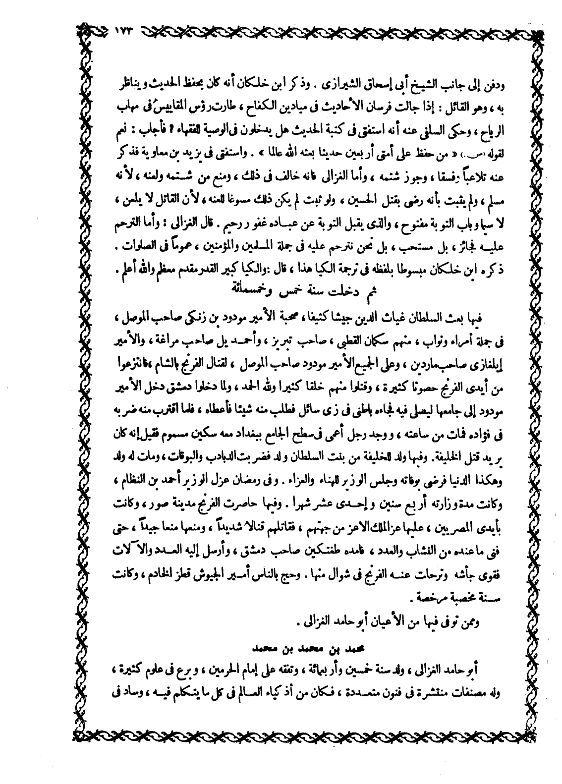 أَبُو حَامِدٍ الْغَزَّالِيُّ، وُلِدَ سَنَةَ خَمْسِينَ وَأَرْبَعِمَائَةٍ، وَتَفَقَّهَ عَلَى إِمَامِ الْحَرَمَيْنِ، وَبَرَعَ فِي عُلُومٍ كَثِيرَةٍ، وَلَهُ مُصَنَّفَاتٌ مُنْتَشِرَةٌ فِي فُنُونٍ مُتَعَدِّدَةٍ، فَكَانَ مِنْ أَذْكِيَاءِ الْعَالَمِ فِي كُلِّ مَا يَتَكَلَّمُ فِيهِ، وساد في