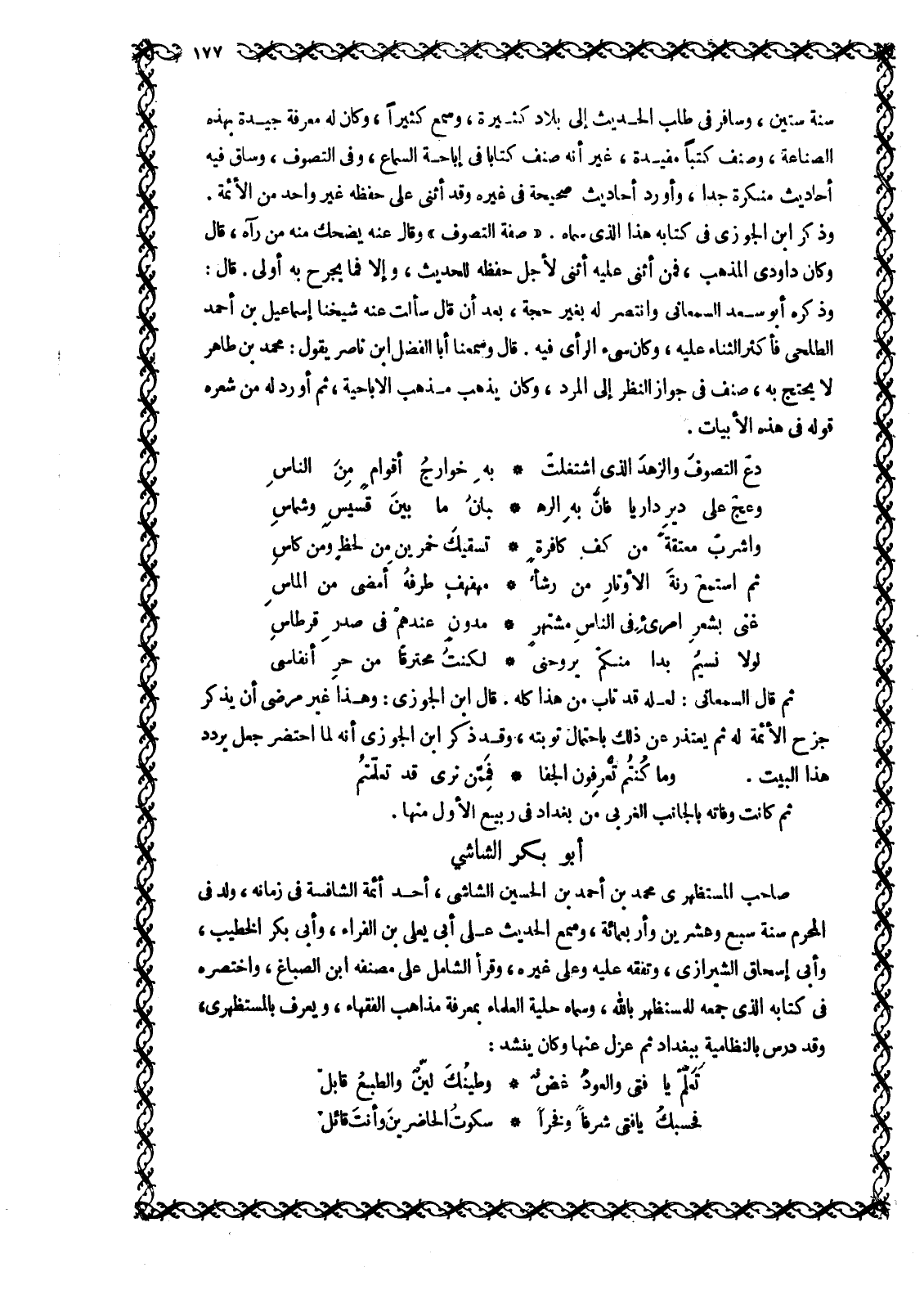 صَاحِبُ الْمُسْتَظْهِرِيِّ مُحَمَّدُ بْنُ أَحْمَدَ بن الحسين الشَّاشِيُّ، أَحَدُ أَئِمَّةِ الشَّافِعِيَّةِ فِي زَمَانِهِ، وُلِدَ فِي الْمُحَرَّمِ سَنَةَ سَبْعٍ وَعِشْرِينَ وَأَرْبَعِمَائَةٍ، وَسَمِعَ الْحَدِيثَ عَلَى أَبِي يَعْلَى بْنِ الْفَرَّاءِ، وَأَبِي بكر الخطيب، وأبى إِسْحَاقَ الشِّيرَازِيِّ، وَتَفَقَّهَ عَلَيْهِ وَعَلَى غَيْرِهِ، وَقَرَأَ الشَّامِلَ عَلَى مُصَنِّفِهِ ابْنِ الصَّبَّاغِ، وَاخْتَصَرَهُ فِي كِتَابِهِ الَّذِي جَمَعَهُ لِلْمُسْتَظْهِرِ باللَّه، وَسَمَّاهُ حِلْيَةَ الْعُلَمَاءِ بِمَعْرِفَةِ مَذَاهِبِ الْفُقَهَاءِ، وَيُعْرَفُ بِالْمُسْتَظْهِرِيِّ، وَقَدْ دَرَّسَ بِالنِّظَامِيَّةِ بِبَغْدَادَ ثُمَّ عُزِلَ عَنْهَا وَكَانَ يُنْشِدُ: