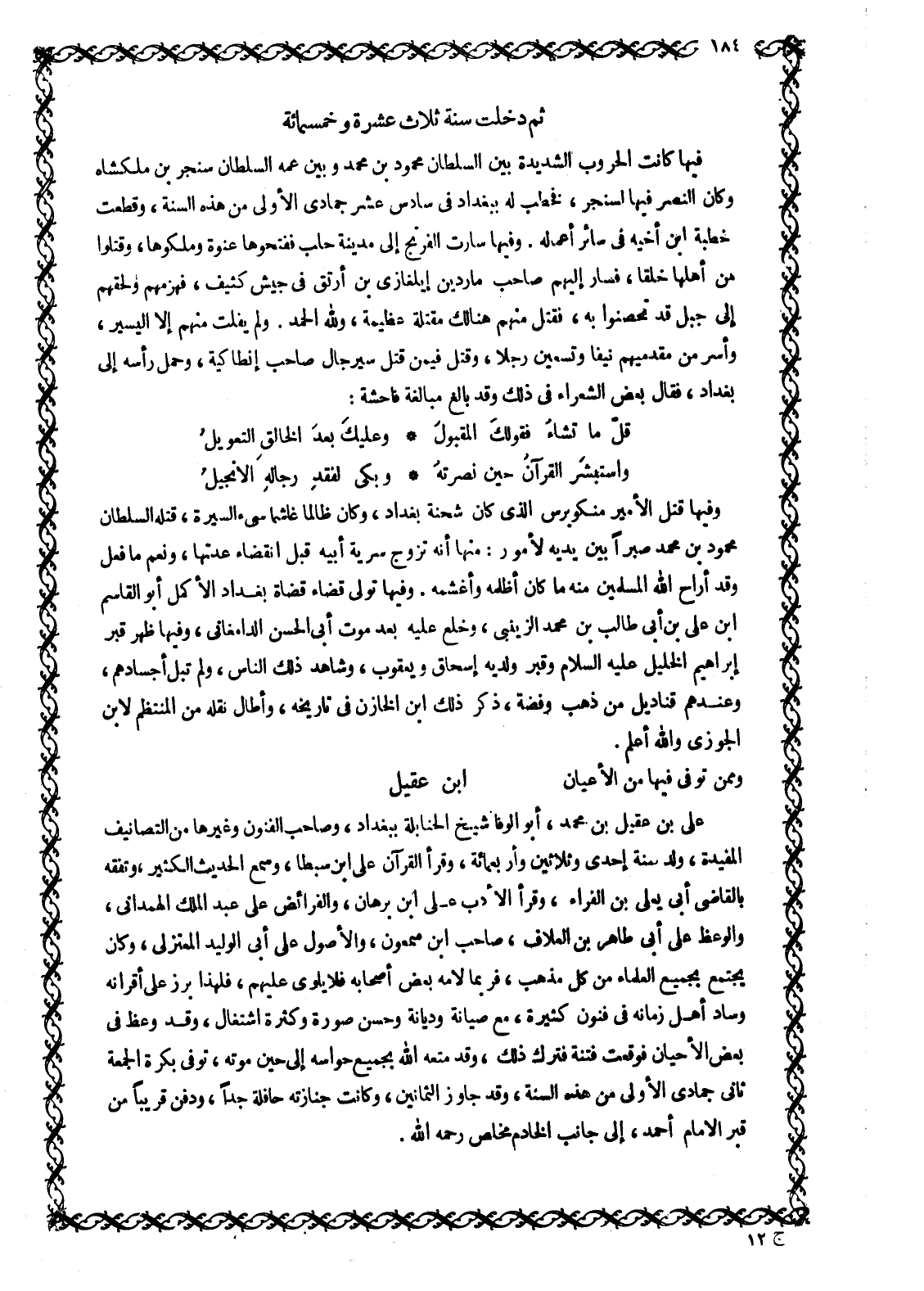 على بن عقيل بن محمد، أبو ألوفا شَيْخُ الْحَنَابِلَةِ بِبَغْدَادَ، وَصَاحِبُ الْفُنُونِ وَغَيْرِهَا مِنَ التَّصَانِيفِ الْمُفِيدَةِ، وُلِدَ سَنَةَ إِحْدَى وَثَلَاثِينَ وَأَرْبَعِمَائَةٍ، وقرأ القرآن على ابن سبطا، وَسَمِعَ الْحَدِيثَ الْكَثِيرَ، وَتَفَقَّهَ بِالْقَاضِي أَبِي يَعْلَى بْنِ الْفَرَّاءِ، وَقَرَأَ الْأَدَبَ عَلَى ابْنِ بَرْهَانَ، والفرائض على عبد الملك الهمدانيّ، وَالْوَعْظَ عَلَى أَبِي طَاهِرِ بْنِ الْعَلَّافِ، صَاحِبِ ابْنِ سَمْعُونَ، وَالْأُصُولَ عَلَى أَبِي الْوَلِيدِ الْمُعْتَزِلِيِّ، وَكَانَ يَجْتَمِعُ بِجَمِيعِ الْعُلَمَاءِ مِنْ كُلِّ مَذْهَبٍ، فَرُبَّمَا لَامَهُ بَعْضُ أَصْحَابِهِ فَلَا يَلْوِي عَلَيْهِمْ، فلهذا برز على أقرانه وساد أَهْلَ زَمَانِهِ فِي فُنُونٍ كَثِيرَةٍ، مَعَ صِيَانَةٍ وَدِيَانَةٍ وَحُسْنِ صُورَةٍ وَكَثْرَةِ اشْتِغَالٍ، وَقَدْ وَعَظَ فِي بَعْضِ الْأَحْيَانِ فَوَقَعَتْ فِتْنَةٌ فَتَرَكَ ذَلِكَ، وَقَدْ مَتَّعَهُ اللَّهُ بِجَمِيعِ حَوَاسِّهِ إِلَى حِينِ موته، توفى بُكْرَةَ الْجُمُعَةِ ثَانِي جُمَادَى الْأُولَى مِنْ هَذِهِ السَّنَةِ، وَقَدْ جَاوَزَ الثَّمَانِينَ، وَكَانَتْ جِنَازَتُهُ حَافِلَةً جِدًّا، وَدُفِنَ قَرِيبًا مِنْ قَبْرِ الْإِمَامِ أَحْمَدَ، إلى جانب الخادم مخلص رحمه الله.