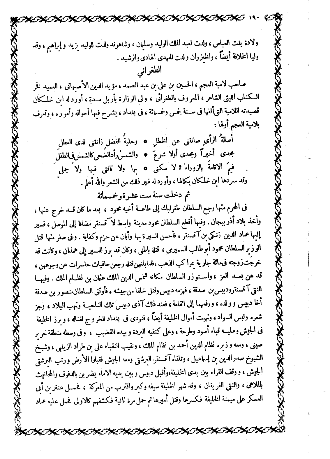 صاحب لَامِيَّةِ الْعَجَمِ، الْحُسَيْنُ بْنُ عَلِيِّ بْنِ عَبْدِ الصَّمَدِ، مُؤَيَّدُ الدِّينِ الْأَصْبَهَانِيُّ، الْعَمِيدُ فَخْرُ الْكُتَّابِ الليثي الشاعر، المعروف بالطغرائى، ولى الوزارة بأربل مدة، أورد له ابْنُ خَلِّكَانَ قَصِيدَتَهُ اللَّامِيَّةَ الَّتِي أَلَّفَهَا فِي سَنَةِ خَمْسٍ وَخَمْسِمِائَةٍ، فِي بَغْدَادَ، يَشْرَحُ فِيهَا أَحْوَالَهُ وَأُمُورَهُ، وَتُعْرَفُ بِلَامِيَّةِ الْعَجَمِ أَوَّلُهَا: