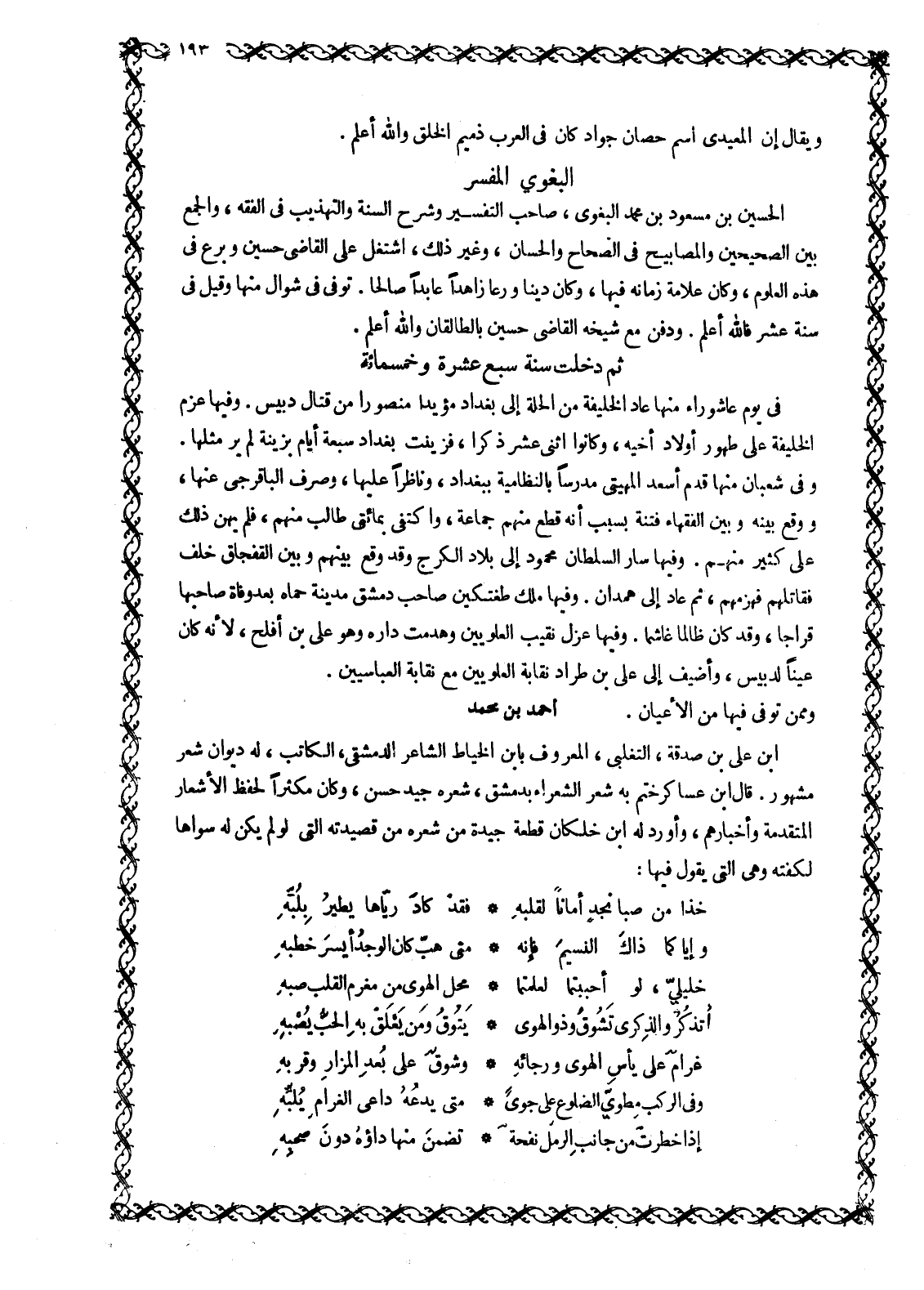 الحسين بن مسعود بن محمد البغوي، صاحب التفسير وشرح السنة والتهذيب في الفقه، والجمع بين الصحيحين والمصابيح فِي الصِّحَاحِ وَالْحِسَانِ، وَغَيْرِ ذَلِكَ، اشْتَغَلَ عَلَى الْقَاضِي حُسَيْنٍ وَبَرَعَ فِي هَذِهِ الْعُلُومِ، وَكَانَ عَلَّامَةَ زَمَانِهِ فِيهَا، وَكَانَ دَيِّنًا وَرِعًا زَاهِدًا عابدا صالحا. توفى في شوال منها وَقِيلَ فِي سَنَةِ عَشْرٍ فاللَّه أَعْلَمُ. وَدُفِنَ مَعَ شَيْخِهِ الْقَاضِي حُسَيْنٍ بِالطَّالَقَانِ وَاللَّهُ أَعْلَمُ.