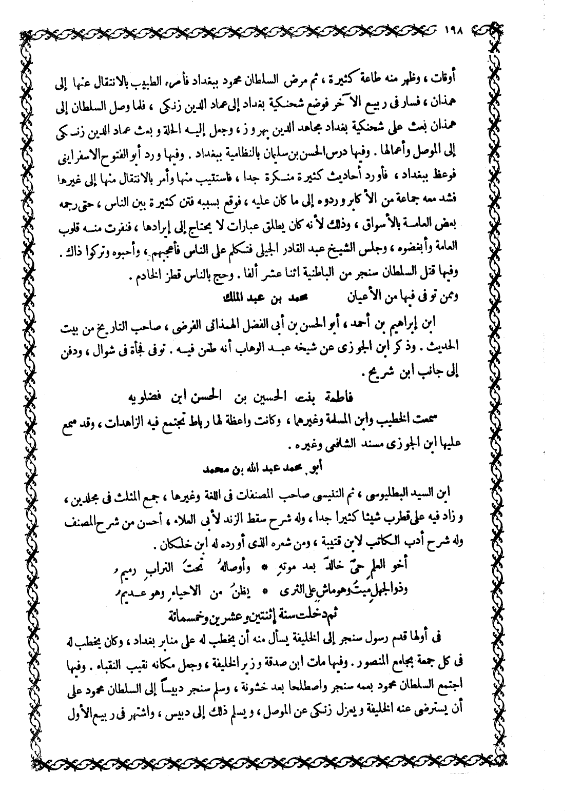 أوقات، وظهر منه طاعة كثيرة، ثُمَّ مَرِضَ السُّلْطَانُ مَحْمُودٌ بِبَغْدَادَ فَأَمَرَهُ الطَّبِيبُ بِالِانْتِقَالِ عَنْهَا إِلَى هَمَذَانَ، فَسَارَ فِي رَبِيعٍ الآخر فوضع شِحْنَكِيَّةِ بَغْدَادَ إِلَى عِمَادِ الدِّينِ زَنْكِي، فَلَمَّا وصل السلطان إلى همذان بعث على شِحْنَكِيَّةِ بَغْدَادَ مُجَاهِدَ الدِّينِ بِهْرُوزَ، وَجَعَلَ إِلَيْهِ الْحِلَّةِ وَبَعَثَ عِمَادَ الدِّينِ زَنْكِي إِلَى الْمَوْصِلِ وأعمالها. وفيها درس الحسن بن سليمان بِالنِّظَامِيَّةِ بِبَغْدَادَ. وَفِيهَا وَرَدَ أَبُو الْفُتُوحِ الْإِسْفَرَايِينِيُّ فَوَعَظَ بِبَغْدَادَ، فَأَوْرَدَ أَحَادِيثَ كَثِيرَةً مُنْكَرَةً جِدًّا، فَاسْتُتِيبَ مِنْهَا وَأُمِرَ بِالِانْتِقَالِ مِنْهَا إِلَى غَيْرِهَا فَشَدَّ مَعَهُ جَمَاعَةٌ مِنَ الْأَكَابِرِ وَرَدُّوهُ إِلَى مَا كَانَ عَلَيْهِ، فَوَقَعَ بِسَبَبِهِ فِتَنٌ كَثِيرَةٌ بين الناس، حتى رجمه بعض العامة بالأسواق، وَذَلِكَ لِأَنَّهُ كَانَ يُطْلِقُ عِبَارَاتٍ لَا يُحْتَاجُ إِلَى إِيرَادِهَا، فَنَفَرَتْ مِنْهُ قُلُوبُ الْعَامَّةِ وَأَبْغَضُوهُ، وَجَلَسَ الشَّيْخُ عَبْدُ الْقَادِرِ الْجِيلِيُّ فَتَكَلَّمَ عَلَى النَّاسِ فَأَعْجَبَهُمْ، وَأَحَبُّوهُ وَتَرَكُوا ذَاكَ.
