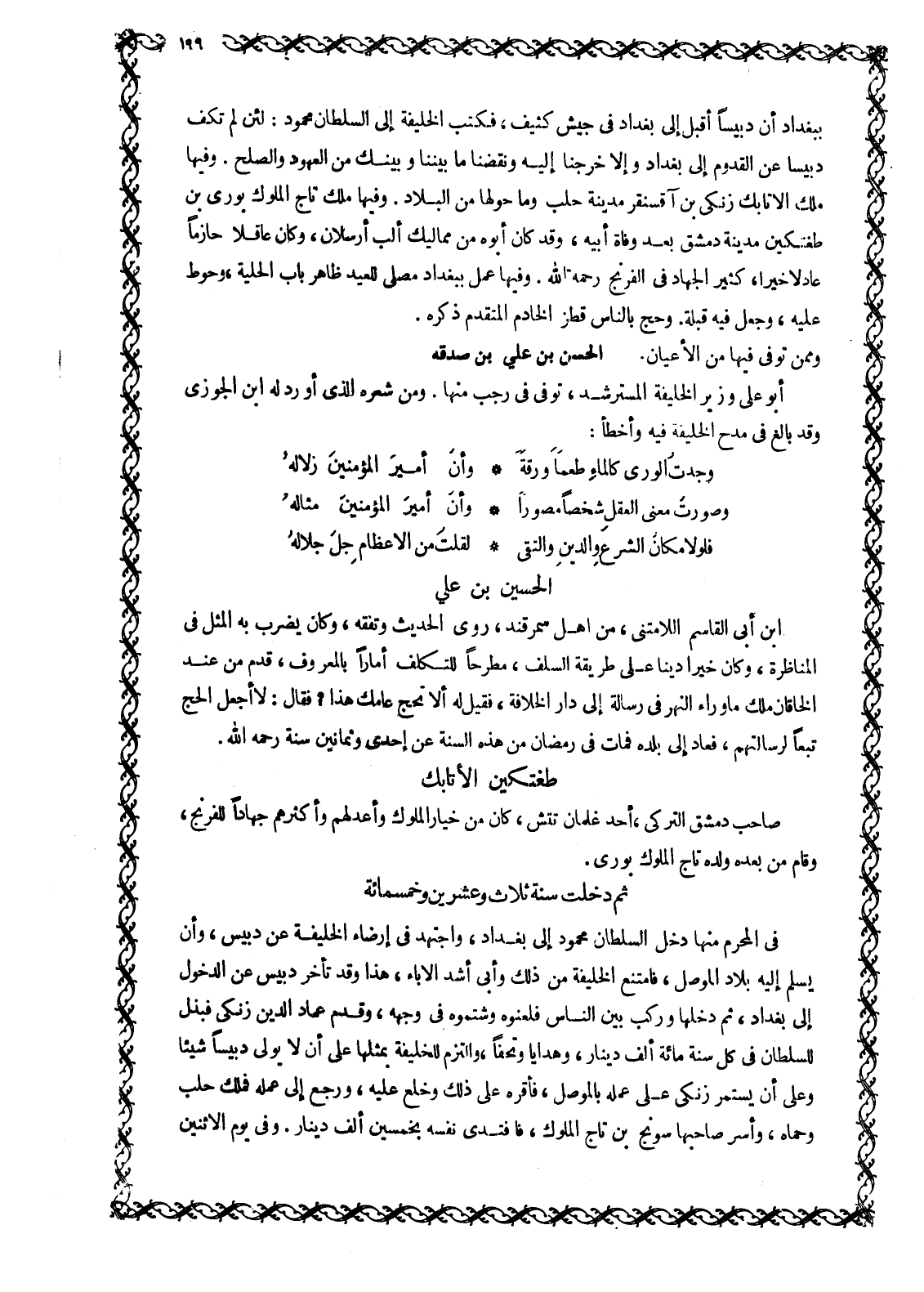 بِبَغْدَادَ أَنَّ دُبَيْسًا أَقْبَلَ إِلَى بَغْدَادَ فِي جيش كثيف، فكتب الخليفة إلى السلطان محمود: لئن لم تكف دبيسا عن القدوم إلى بَغْدَادَ وَإِلَّا خَرَجْنَا إِلَيْهِ وَنَقَضْنَا مَا بَيْنَنَا وَبَيْنَكَ مِنَ الْعُهُودِ وَالصُّلْحِ. وَفِيهَا مَلَكَ الْأَتَابِكُ زنكي بن آقسنقر مَدِينَةَ حَلَبَ وَمَا حَوْلَهَا مِنَ الْبِلَادِ. وَفِيهَا مَلَكَ تَاجُ الْمُلُوكِ بُورَى بْنُ طُغْتِكِينَ مَدِينَةَ دِمَشْقَ بَعْدَ وَفَاةِ أَبِيهِ، وَقَدْ كَانَ أَبُوهُ من مماليك أَلْبِ أَرْسَلَانَ، وَكَانَ عَاقِلًا حَازِمًا عَادِلًا خَيِّرًا، كثير الجهاد في الفرنج رَحِمَهُ اللَّهُ. وَفِيهَا عُمِلَ بِبَغْدَادَ مُصَلًّى لِلْعِيدِ ظاهر باب الحلية، وَحُوِّطَ عَلَيْهِ، وَجُعِلَ فِيهِ قِبْلَةٌ. وَحَجَّ بِالنَّاسِ قطز الخادم المتقدم ذكره.