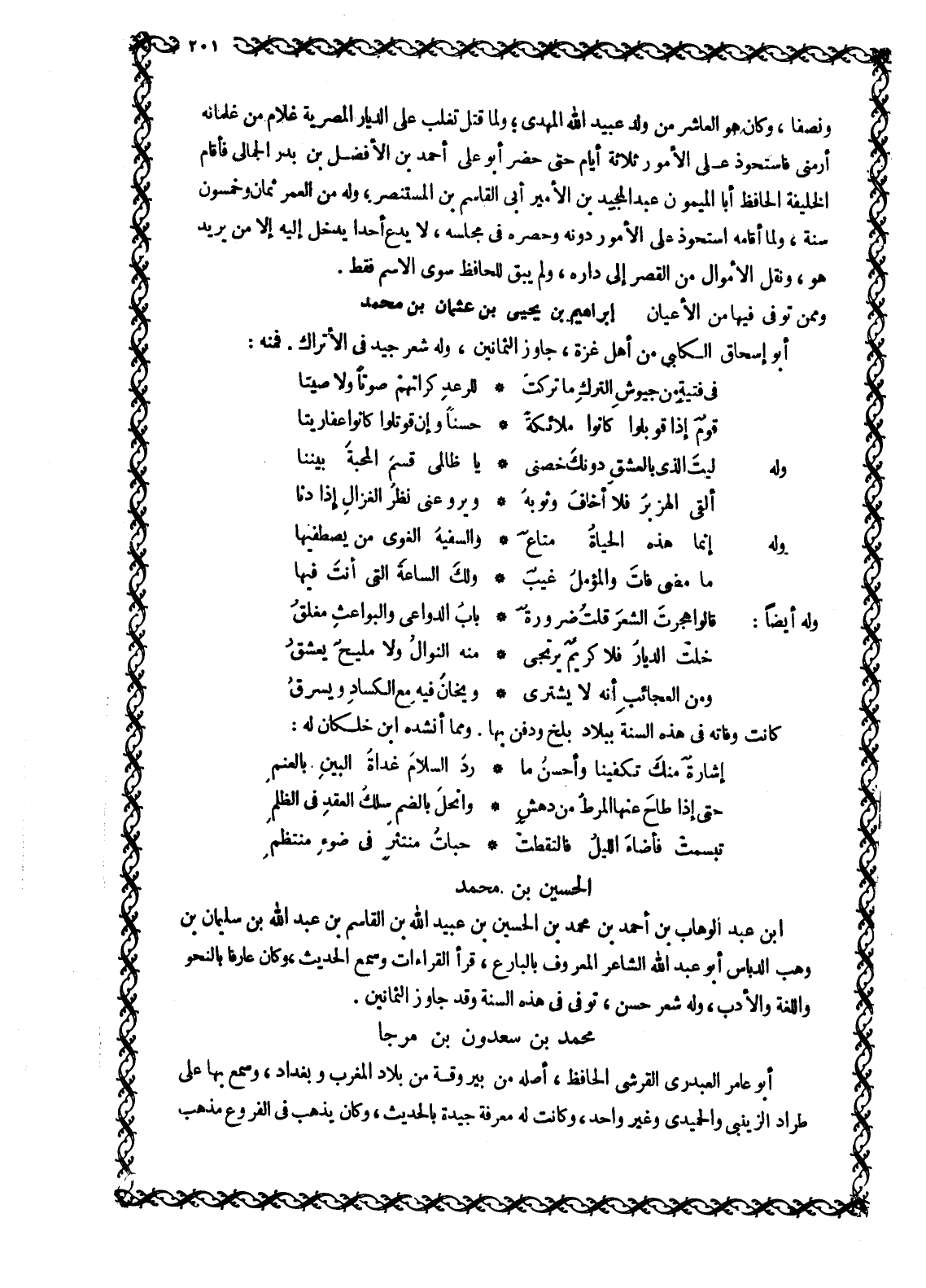 ابن عَبْدِ الْوَهَّابِ بْنِ أَحْمَدَ بْنِ مُحَمَّدِ بْنِ الْحُسَيْنِ بْنِ عُبَيْدِ اللَّهِ بْنِ الْقَاسِمِ بْنِ عَبْدِ اللَّهِ بْنِ سُلَيْمَانَ بْنِ وَهْبٍ الدَّبَّاسُ أَبُو عَبْدِ اللَّهِ الشَّاعِرُ الْمَعْرُوفُ بِالْبَارِعِ، قَرَأَ الْقِرَاءَاتِ وَسَمِعَ الْحَدِيثَ، وَكَانَ عَارِفًا بِالنَّحْوِ وَاللُّغَةِ والأدب، وله شعر حسن، تُوُفِّيَ فِي هَذِهِ السَّنَةِ وَقَدْ جَاوَزَ الثَّمَانِينَ.