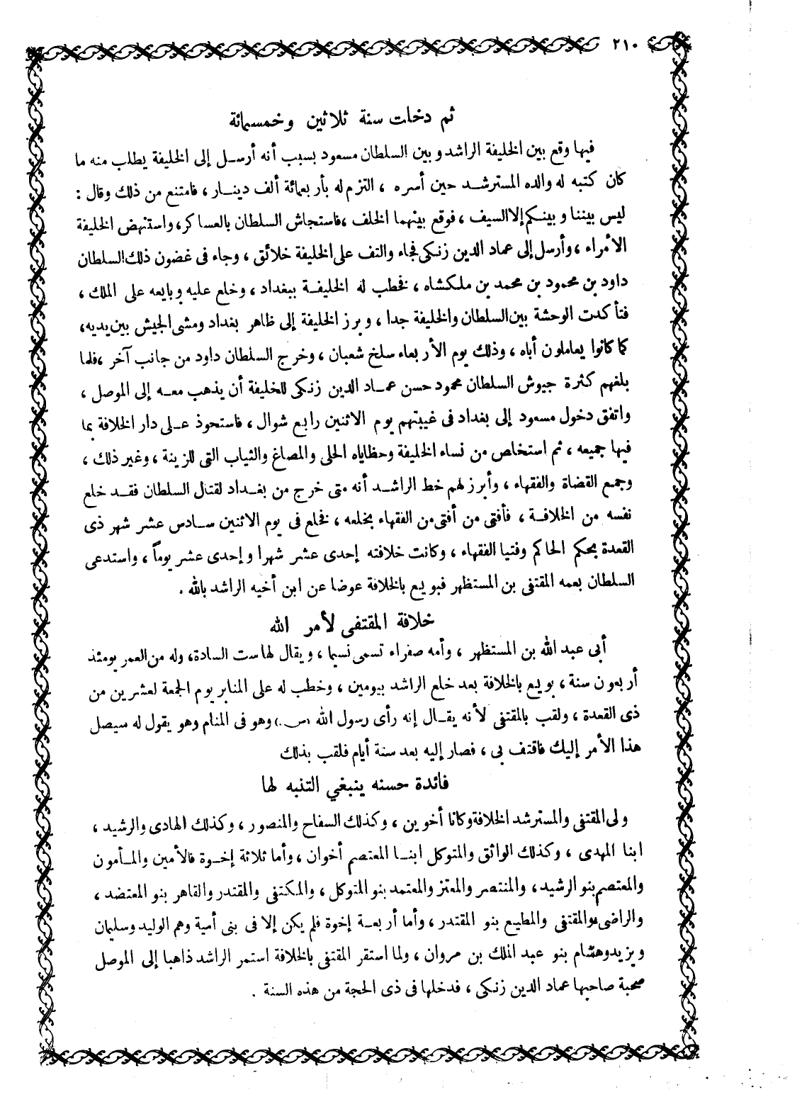 وَلِيَ الْمُقْتَفِي وَالْمُسْتَرْشِدُ الْخِلَافَةَ وَكَانَا أَخَوَيْنِ، وَكَذَلِكَ السَّفَّاحُ وَالْمَنْصُورُ، وَكَذَلِكَ الْهَادِي وَالرَّشِيدُ، ابْنَا الْمَهْدِيِّ، وَكَذَلِكَ الْوَاثِقُ وَالْمُتَوَكِّلُ ابْنَا الْمُعْتَصِمِ أَخَوَانِ، وَأَمَّا ثَلَاثَةُ إِخْوَةٍ فَالْأَمِينُ وَالْمَأْمُونُ وَالْمُعْتَصِمُ بَنُو الرَّشِيدِ، وَالْمُنْتَصِرُ وَالْمُعْتَزُّ وَالْمُعْتَمِدُ بَنُو الْمُتَوَكِّلِ، وَالْمُكْتَفِي وَالْمُقْتَدِرُ وَالْقَاهِرُ بَنُو الْمُعْتَضِدِ، وَالرَّاضِي وَالْمُقْتَفِي وَالْمُطِيعُ بَنُو الْمُقْتَدِرِ، وَأَمَّا أَرْبَعَةُ إِخْوَةٍ فَلَمْ يَكُنْ إِلَّا فِي بَنِي أُمَيَّةَ وَهُمُ الْوَلِيدُ وَسُلَيْمَانُ وَيَزِيدُ وَهِشَامُ بَنُو عَبْدِ الْمَلِكِ بْنِ مَرْوَانَ، وَلَمَّا اسْتَقَرَّ الْمُقْتَفِي بِالْخِلَافَةِ اسْتَمَرَّ الرَّاشِدُ ذَاهِبًا إِلَى الْمَوْصِلِ صُحْبَةَ صَاحِبِهَا عِمَادِ الدِّينِ زَنْكِي، فَدَخَلَهَا في ذي الحجة من هذه السنة.