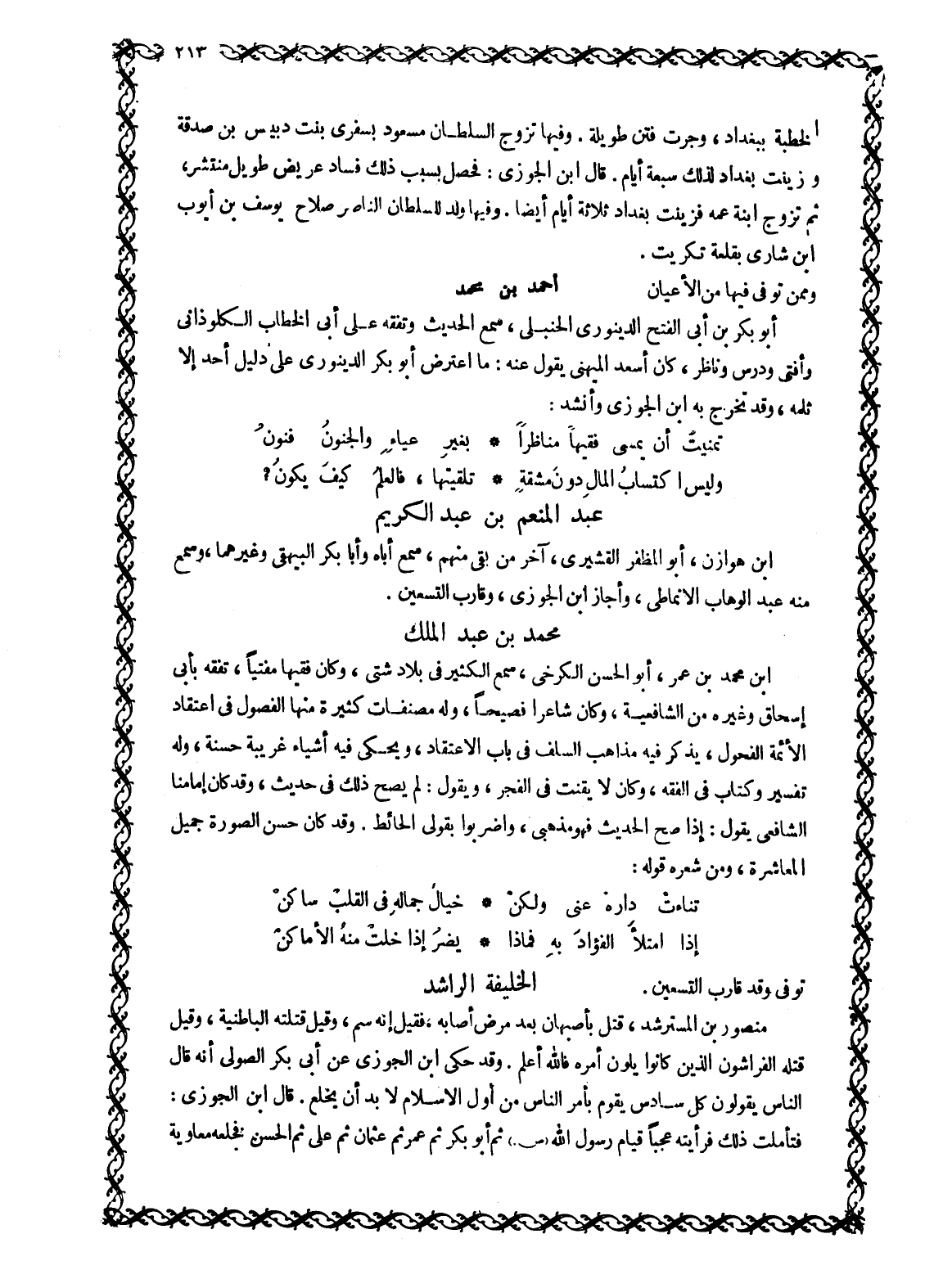 منصور بن المسترشد، قتل بأصبهان بَعْدَ مَرَضٍ أَصَابَهُ، فَقِيلَ إِنَّهُ سُمَّ، وَقِيلَ قَتَلَتْهُ الْبَاطِنِيَّةُ، وَقِيلَ قَتَلَهُ الْفَرَّاشُونَ الَّذِينَ كَانُوا يَلُونَ أَمْرَهُ فاللَّه أَعْلَمُ. وَقَدْ حَكَى ابْنُ الْجَوْزِيِّ عَنْ أَبِي بَكْرٍ الصُّولِيِّ أَنَّهُ قَالَ النَّاسُ يَقُولُونَ كُلُّ سَادِسٍ يَقُومُ بِأَمْرِ النَّاسِ مِنْ أَوَّلِ الْإِسْلَامِ لَا بُدَّ أَنْ يُخْلَعَ. قَالَ ابْنُ الْجَوْزِيِّ: