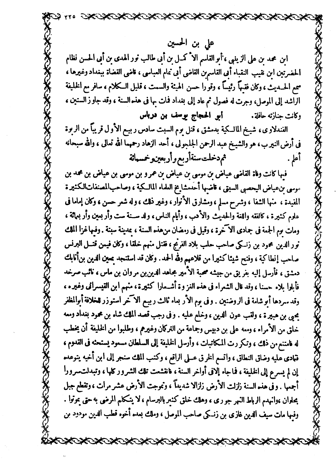 فِيهَا كَانَتْ وَفَاةُ الْقَاضِي عِيَاضِ بْنِ مُوسَى بْنِ عِيَاضِ بْنِ عَمْرِو بْنِ مُوسَى بْنِ عِيَاضِ بْنِ مُحَمَّدِ بْنِ مُوسَى بْنِ عِيَاضٍ الْيَحْصُبِيِّ السَّبْتِيِّ، قَاضِيهَا أَحَدُ مَشَايِخِ الْعُلَمَاءِ الْمَالِكِيَّةِ، وصاحب المصنفات الكثيرة المفيدة، منها الشفا، وشرح مسلم، ومشارق الْأَنْوَارِ، وَغَيْرُ ذَلِكَ، وَلَهُ شِعْرٌ حَسَنٌ، وَكَانَ إِمَامًا فِي عُلُومٍ كَثِيرَةٍ، كَالْفِقْهِ وَاللُّغَةِ وَالْحَدِيثِ وَالْأَدَبِ، وَأَيَّامِ النَّاسِ، وُلِدَ سَنَةَ سِتٍّ وَأَرْبَعِينَ وأربعمائة، ومات يَوْمَ الْجُمُعَةِ فِي جُمَادَى الْآخِرَةِ، وَقِيلَ فِي رمضان من هذه السنة، بمدينة سبتة. وَفِيهَا غَزَا الْمَلِكُ نُورُ الدِّينِ مَحْمُودُ بْنُ زَنْكِيٍّ صَاحِبُ حَلَبَ بِلَادَ الْفِرِنْجِ، فَقَتَلَ مِنْهُمْ خلقا، وكان فيمن قَتَلَ الْبِرِنْسُ صَاحِبُ أَنْطَاكِيَةَ، وَفَتَحَ شَيْئًا كَثِيرًا من قلاعهم وللَّه الحمد. وَكَانَ قَدِ اسْتَنْجَدَ بِمُعِينِ الدِّينِ بْنِ أَتَابِكِ دِمَشْقَ، فَأَرْسَلَ إِلَيْهِ بِفَرِيقٍ مِنْ جَيْشِهِ صُحْبَةَ الأمير مجاهد الدين بن مروان بن ماس، نَائِبِ صَرْخَدَ فَأَبْلَوْا بَلَاءً حَسَنًا، وَقَدْ قَالَ الشُّعَرَاءُ فِي هَذِهِ الْغَزْوَةِ أَشْعَارًا كَثِيرَةً، مِنْهُمُ ابْنُ الْقَيْسَرَانِيِّ وَغَيْرُهُ، وَقَدْ سَرَدَهَا أَبُو شَامَةَ فِي الرَّوْضَتَيْنِ. وَفِي يَوْمِ الْأَرْبِعَاءِ ثَالِثَ رَبِيعٍ الْآخَرِ اسْتَوْزَرَ لِلْخِلَافَةِ أَبُو الْمُظَفَّرِ يَحْيَى بْنُ هُبَيْرَةَ، وَلُقِّبَ عَوْنُ الدِّينِ، وَخُلِعَ عَلَيْهِ. وَفِي رجب قصد الملك شاه بْنُ مَحْمُودٍ بَغْدَادَ وَمَعَهُ خَلْقٌ مِنَ الْأُمَرَاءِ، وَمَعَهُ عَلِيُّ بْنُ دُبَيْسٍ وَجَمَاعَةٌ مِنَ التُّرْكُمَانِ وَغَيْرُهُمْ، وَطَلَبُوا مِنَ الْخَلِيفَةِ أَنْ يُخْطَبَ لَهُ فَامْتَنَعَ مِنْ ذَلِكَ، وَتَكَرَّرَتِ الْمُكَاتَبَاتُ، وَأَرْسَلَ الْخَلِيفَةُ إِلَى السُّلْطَانِ مَسْعُودٍ يَسْتَحِثُّهُ فِي الْقُدُومِ، فَتَمَادَى عَلَيْهِ وَضَاقَ النِّطَاقُ، وَاتَّسَعَ الْخَرْقُ عَلَى الرَّاقِعِ، وكتب الملك سنجر إلى ابن أخيه يتوعده إن لم يسرع إِلَى الْخَلِيفَةِ، فَمَا جَاءَ إِلَّا فِي أَوَاخِرِ السَّنَةِ، فَانْقَشَعَتْ تِلْكَ الشُّرُورُ كُلُّهَا، وَتَبَدَّلَتْ سُرُورًا أَجْمَعُهَا. وَفِي هَذِهِ السَّنَةِ زُلْزِلَتِ الْأَرْضُ زِلْزَالًا شَدِيدًا، وَتَمَوَّجَتِ الْأَرْضُ عَشْرَ مَرَّاتٍ، وَتَقَطَّعَ جَبَلٌ بحلوان، وانهدم الرباط النهر جوري، وَهَلَكَ خَلْقٌ كَثِيرٌ بِالْبِرْسَامِ، لَا يَتَكَلَّمُ الْمَرْضَى به حَتَّى يَمُوتُوا.
