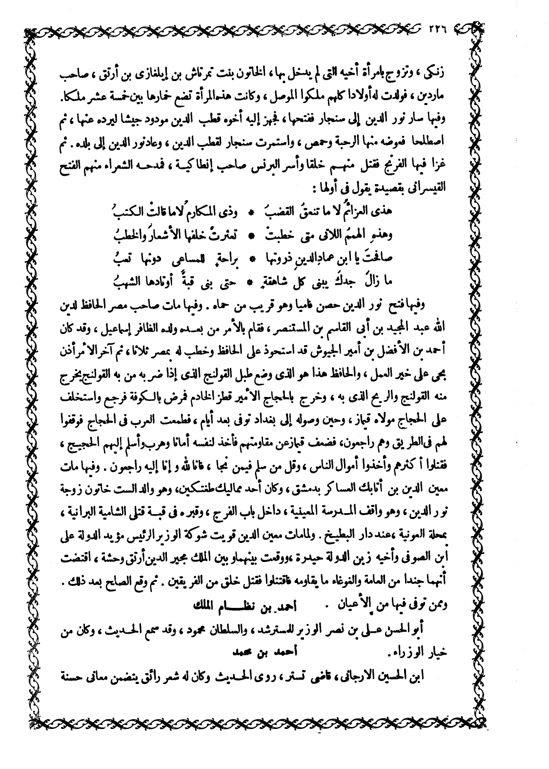 زَنْكِيٍّ، وَتَزَوَّجَ بِامْرَأَةِ أَخِيهِ الَّتِي لَمْ يَدْخُلْ بِهَا، الْخَاتُونِ بِنْتِ تَمُرْتَاشَ بْنِ إِيلِغَازِي بْنِ أُرْتُقَ، صَاحِبِ مَارِدِينَ، فَوَلَدَتْ لَهُ أَوْلَادًا كُلُّهُمْ ملكوا الموصل، وكانت هذه المرأة تضع خمارها بين خَمْسَةَ عَشَرَ مَلِكًا.