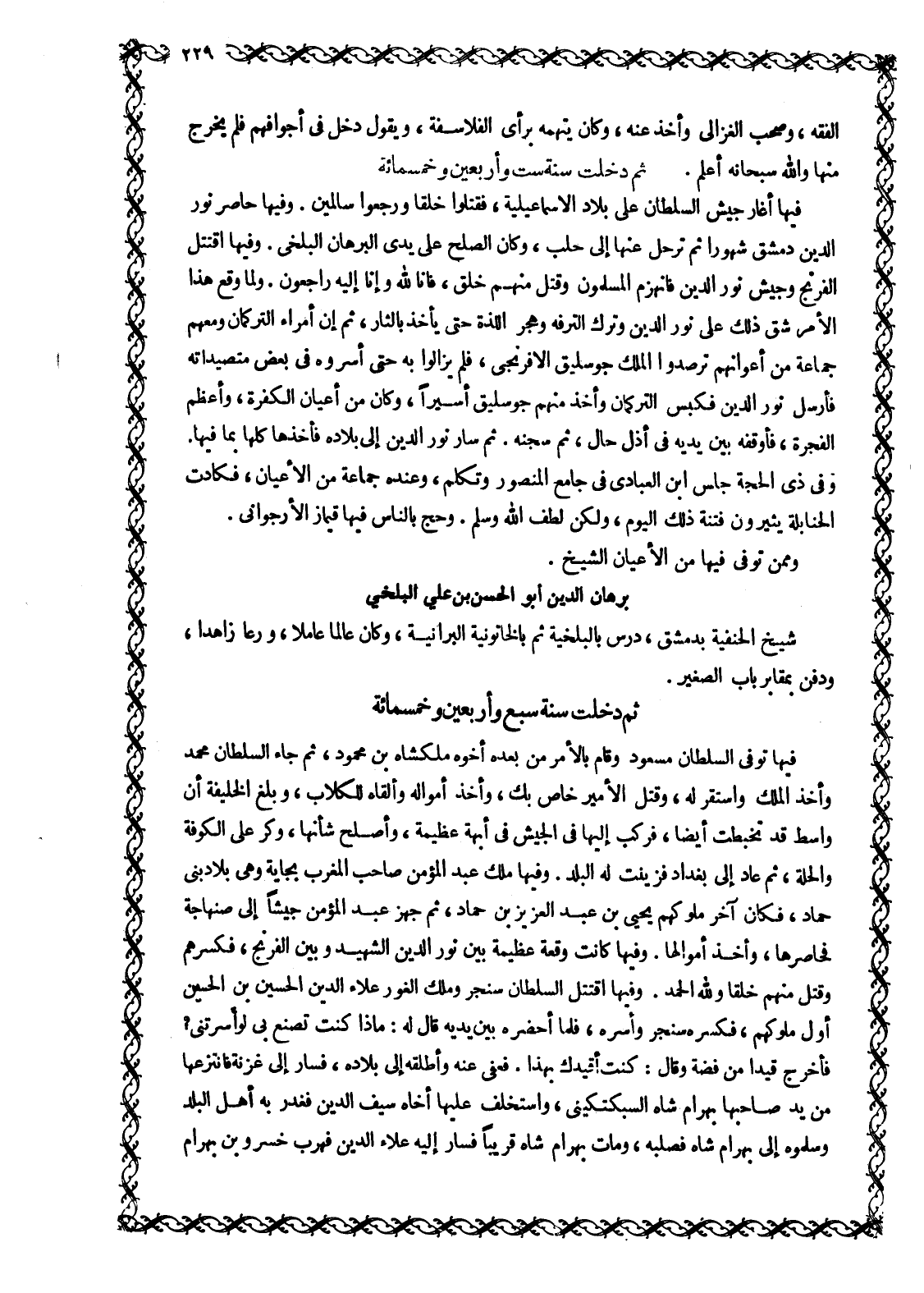 فِيهَا أَغَارَ جَيْشُ السُّلْطَانِ عَلَى بِلَادِ الْإِسْمَاعِيلِيَّةِ، فَقَتَلُوا خَلْقًا وَرَجَعُوا سَالِمِينَ. وَفِيهَا حَاصَرَ نُورُ الدين دمشق شهورا ثم ترحل عنها إلى حلب، وكان الصلح على يدي البرهان البلخي. وفيها اقتتل الفرنج وجيش نور الدين فانهزم المسلمون وقتل منهم خلق، ف إِنَّا لِلَّهِ وَإِنَّا إِلَيْهِ راجِعُونَ 2: 156. وَلَمَّا وَقَعَ هَذَا الأمر شق ذلك على نور الدين وترك الترفه وهجر اللذة حتى يأخذ بالثار، ثم إن أمراء التركمان ومعهم جماعة من أعوانهم ترصدوا الملك جوسليق الْإِفْرِنْجِيِّ، فَلَمْ يَزَالُوا بِهِ حَتَّى أَسَرُوهُ فِي بَعْضِ مُتَصَيِّدَاتِهِ فَأَرْسَلَ نُورُ الدِّينِ فَكَبَسَ التُّرْكُمَانَ وأخذ منهم جوسليق أسيرا، وكان من أعيان الكفرة، وأعظم الفجرة، فَأَوْقَفَهُ بَيْنَ يَدَيْهِ فِي أَذَلِّ حَالٍ، ثُمَّ سجنه. ثم سار نُورُ الدِّينِ إِلَى بِلَادِهِ فَأَخَذَهَا كُلَّهَا بِمَا فِيهَا.