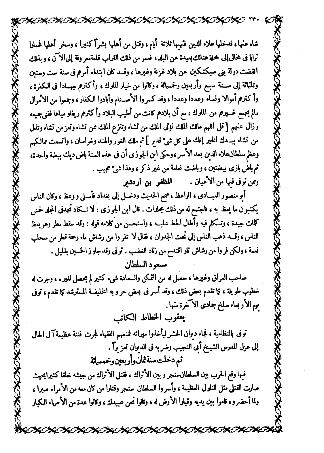 شَاهْ عَنْهَا، فَدَخَلَهَا عَلَاءُ الدِّينِ فَنَهْبَهَا ثَلَاثَةَ أَيَّامٍ، وَقَتَلَ مِنْ أَهْلِهَا بَشَرًا كَثِيرًا، وَسَخَّرَ أهلها فحملوا ترابا في مخالى إلى محلة هنالك بَعِيدَةٍ عَنِ الْبَلَدِ، فَعَمَّرَ مِنْ ذَلِكَ التُّرَابِ قَلْعَةً مَعْرُوفَةً إِلَى الْآنِ، وَبِذَلِكَ انْقَضَتْ دَوْلَةُ بَنِي سُبُكْتُكِينَ عَنْ بِلَادِ غَزْنَةَ وَغَيْرِهَا، وَقَدْ كَانَ ابْتِدَاءُ أَمْرِهِمْ فِي سَنَةِ سِتٍّ وَسِتِّينَ وثلاثمائة إلى سنة سبع وأربعين وخمسمائة، وَكَانُوا مِنْ خِيَارِ الْمُلُوكِ، وَأَكْثَرِهِمْ جِهَادًا فِي الكفرة، وأكثرهم أموالا ونساء وعددا وعددا، وقد كَسَرُوا الْأَصْنَامَ وَأَبَادُوا الْكُفَّارَ، وَجَمَعُوا مِنَ الْأَمْوَالِ مَا لَمْ يَجْمَعْ غَيْرُهُمْ مِنَ الْمُلُوكِ، مَعَ أن بلادهم كانت من أطيب البلاد وأكثرهم رِيفًا وَمِيَاهًا فَفَنِيَ جَمِيعُهُ وَزَالَ عَنْهُمْ (قُلِ اللَّهُمَّ مالِكَ الْمُلْكِ تُؤْتِي الْمُلْكَ مَنْ تَشاءُ وَتَنْزِعُ الْمُلْكَ مِمَّنْ تَشاءُ وَتُعِزُّ مَنْ تَشاءُ وَتُذِلُّ مَنْ تَشاءُ بِيَدِكَ الْخَيْرُ إِنَّكَ عَلى كُلِّ شَيْءٍ قَدِيرٌ) 3: 26 ثُمَّ مَلَكَ الْغُورَ وَالْهِنْدَ وَخُرَاسَانَ، وَاتَّسَعَتْ مَمَالِكُهُمْ وعظم سلطان علاء الدين بعد الأسر، وحكى ابن الجوزي أَنَّ فِي هَذِهِ السَّنَةِ بَاضَ دِيكٌ بَيْضَةً واحدة، ثم باض بازي بيضتين، وباضت نعامة من غير ذكر، وهذا شيء عجيب.